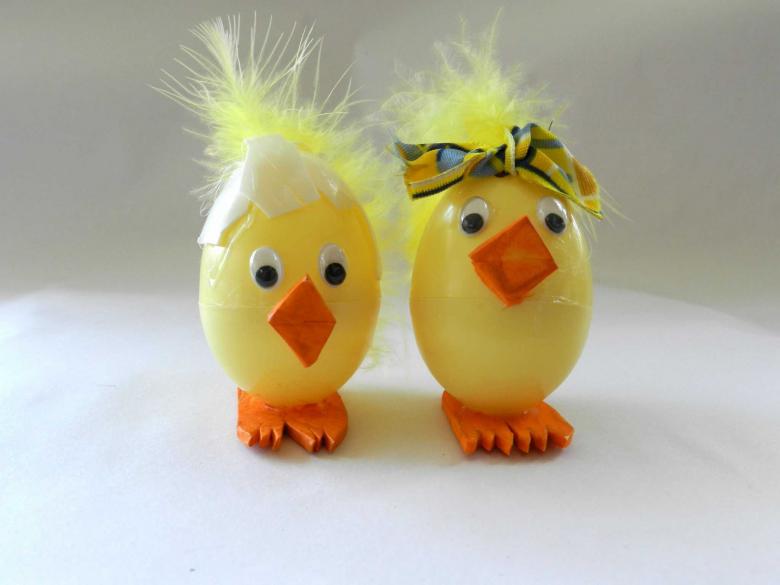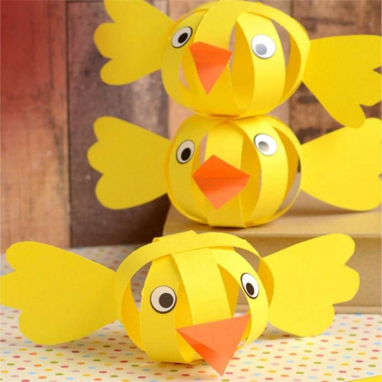 Les ailes et les becs des poussins sont découpés dans du papier de couleur. Peignez les découpes de carton en jaune (de préférence avec de la peinture acrylique) et laissez-les finir de sécher. Attachez les parties en papier aux éléments colorés et scotchez les deux moitiés ensemble. Enfin, collez les yeux.