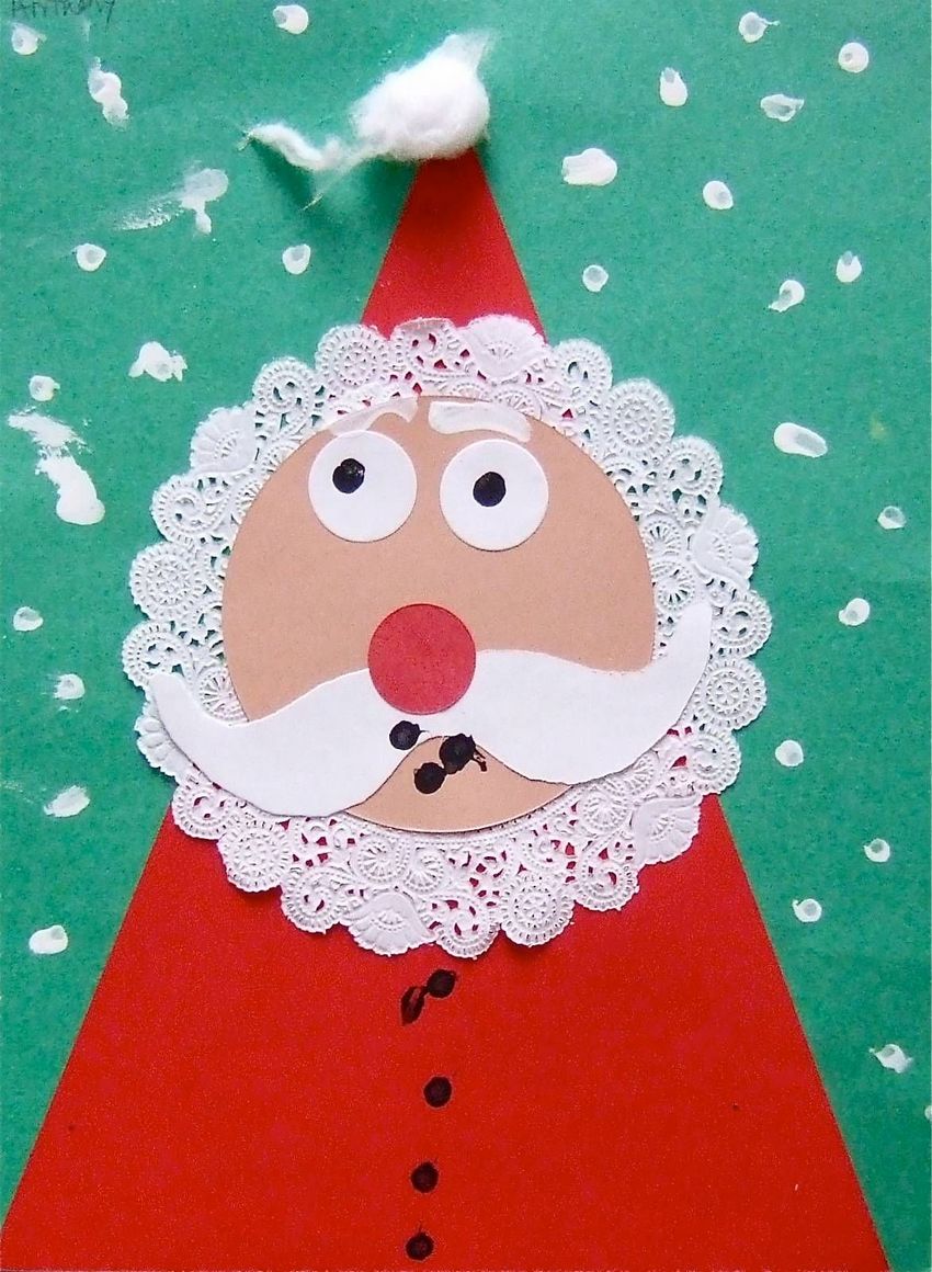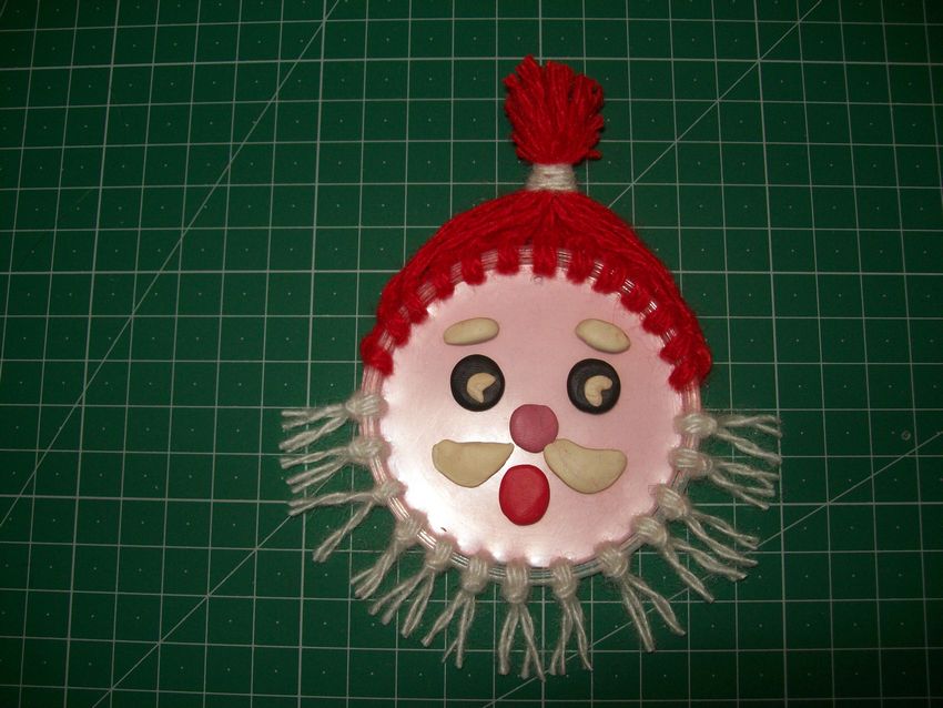 - L'œuf est tourné avec l'extrémité pointue vers le bas. C'est le visage de la création du Père Noël. Collé au sommet d'un triangle et d'un chapeau rouge ;