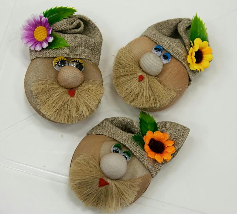 Le pompon ainsi obtenu servira de corps à l'homme de maison. Collez-y les pièces préparées avec de la colle à PVC. On a un garçon dovyonovka. Pour une fille, il suffit de coller un joli nœud ou une fleur sur le dessus.