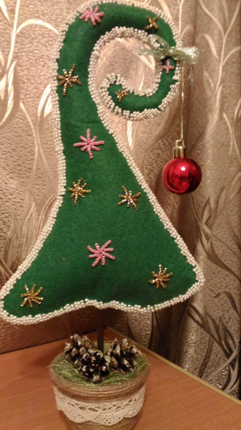 Cousez un vide, sans oublier de coudre le tronc de l'arbre. Attachez une boucle de ruban au sommet de l'arbre. Pour que l'arbre ait l'air intéressant, vous pouvez pré-coudre à la préparation des perles, des boutons colorés ou des paillettes, et coller des strass.