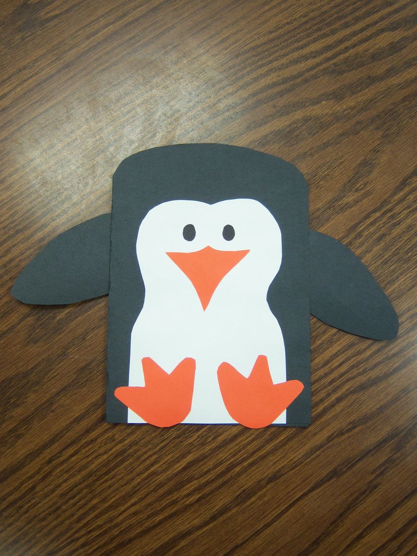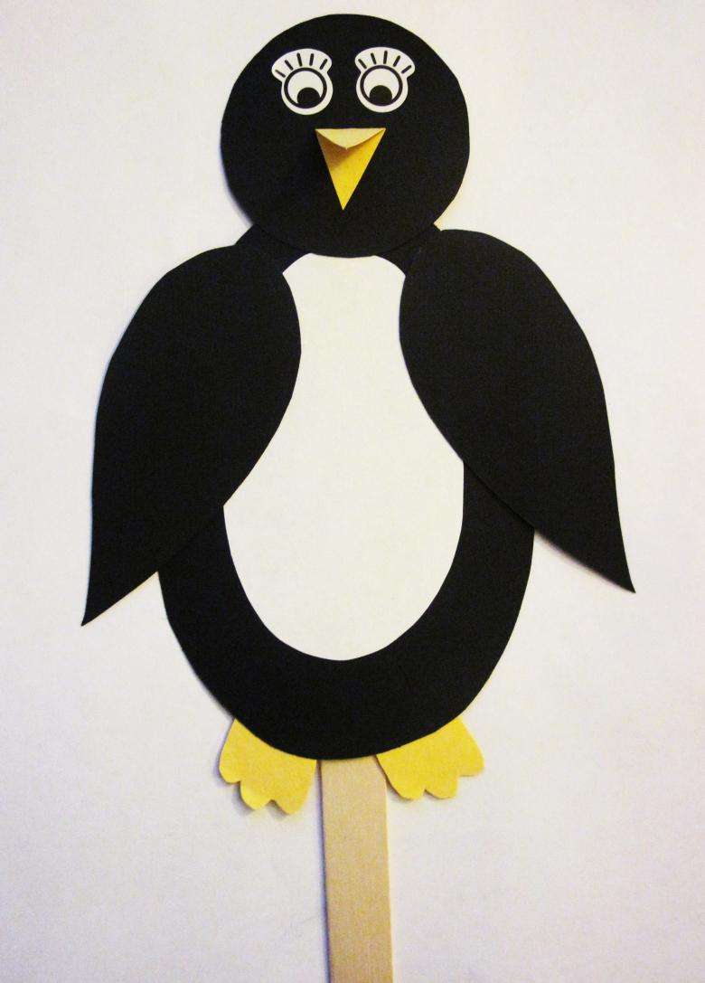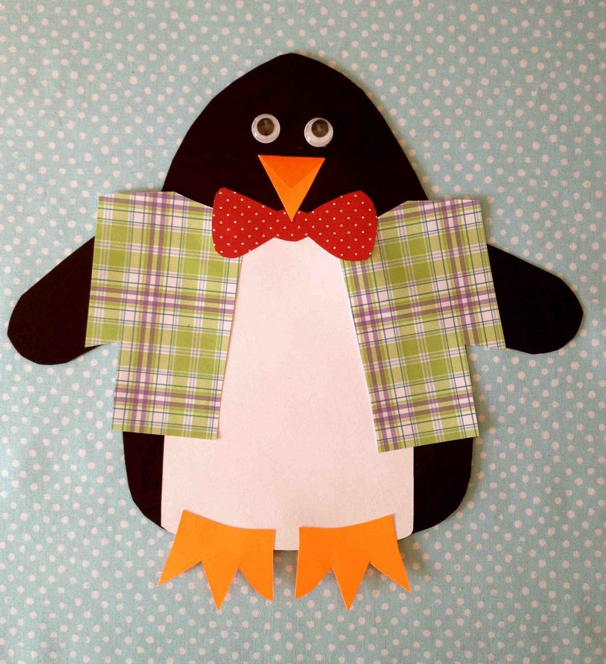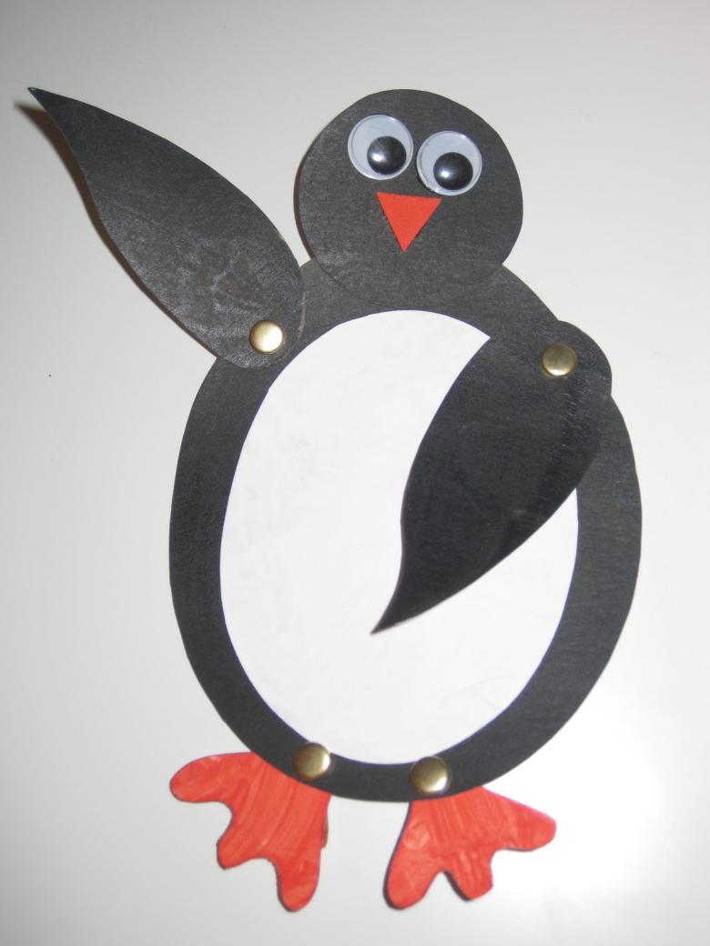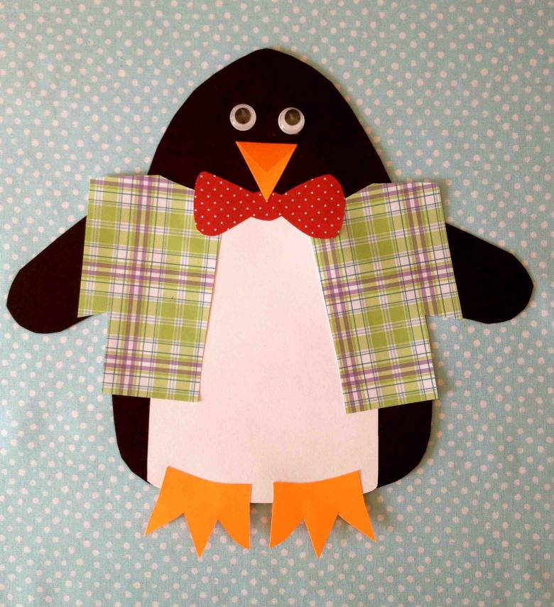 Ensuite, tout est facile, tu peux discrètement "finir" à notre pingouin ses pattes et ses ailes avec un bec. Sous la feuille, le fil ne sera pas visible, et la construction tiendra bien mieux que n'importe quelle colle ou ruban adhésif.