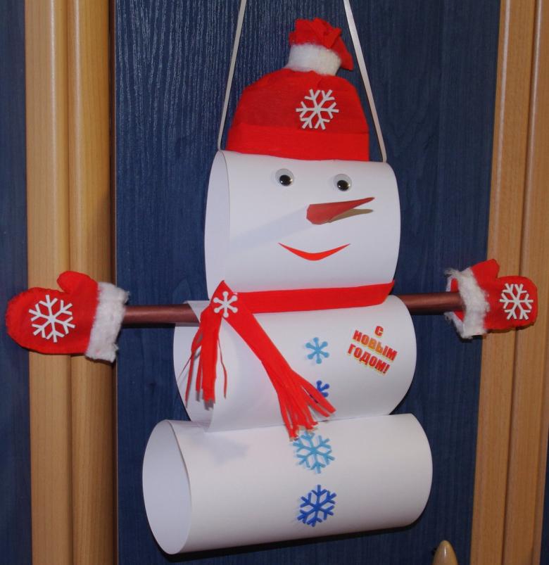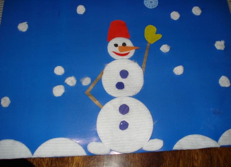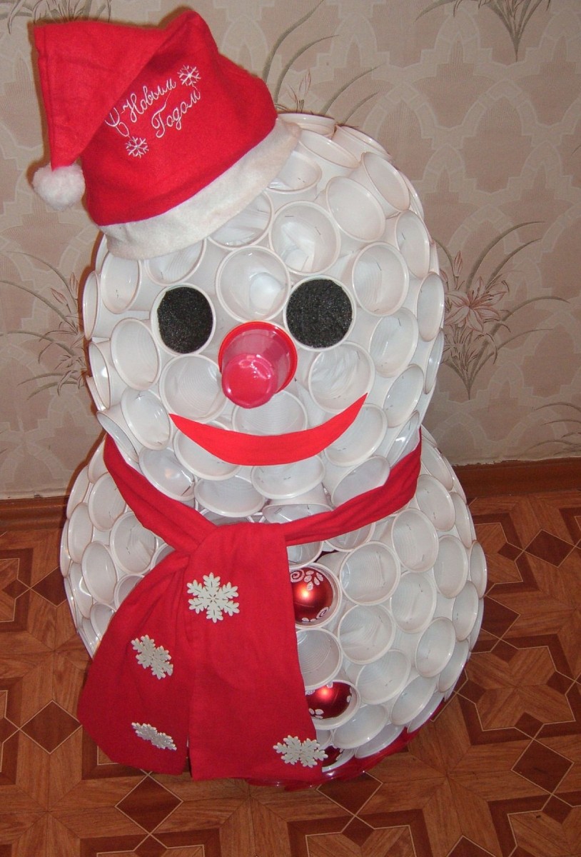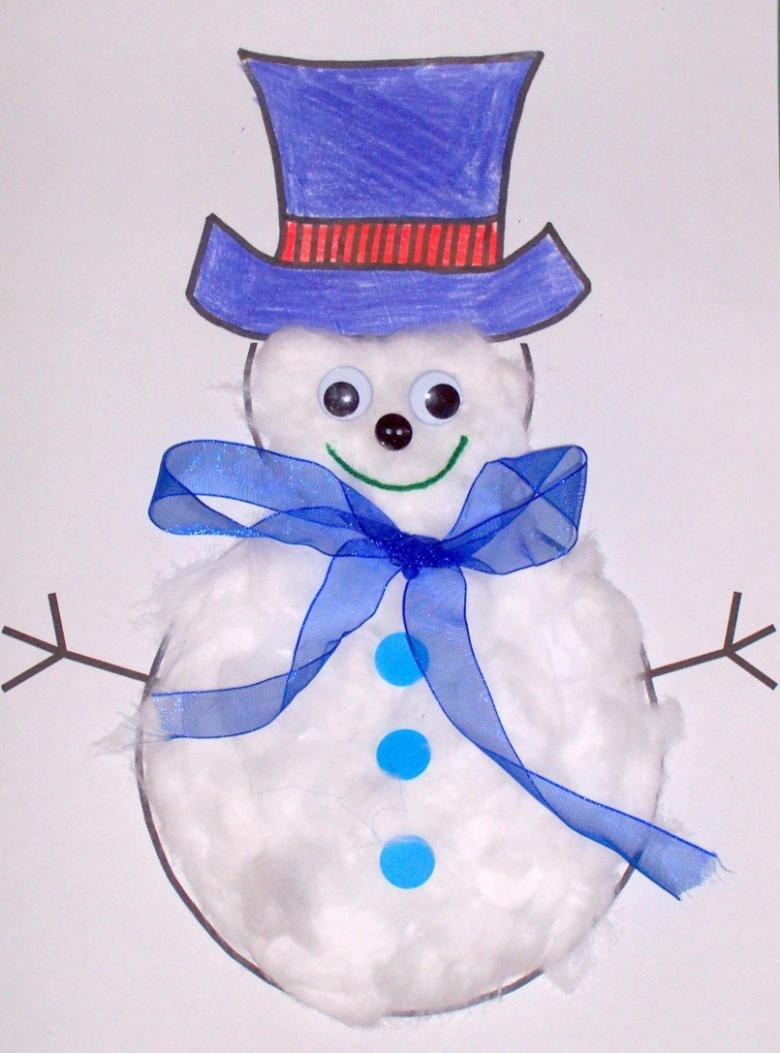 Le bonhomme de neige doit être décoré intelligemment en ajoutant de la luminosité et en accentuant le chapeau, les boutons et l'écharpe. Il faut ajouter un nez et des yeux orange. Grâce à l'utilisation de ruban adhésif double face, le bonhomme de neige semble être tridimensionnel. Tous les objets artisanaux pour le jardin d'enfants sont prêts.