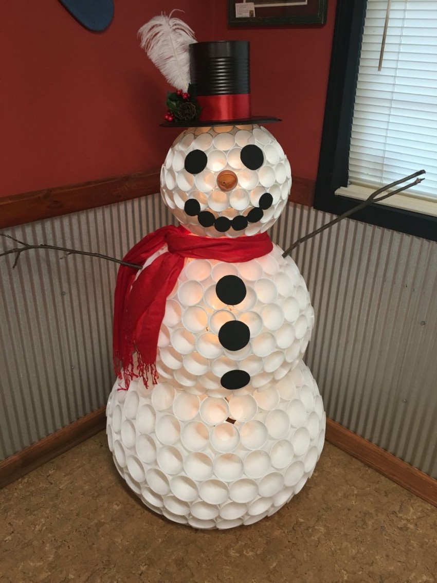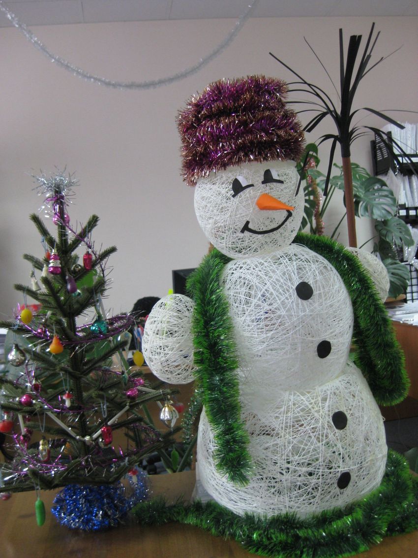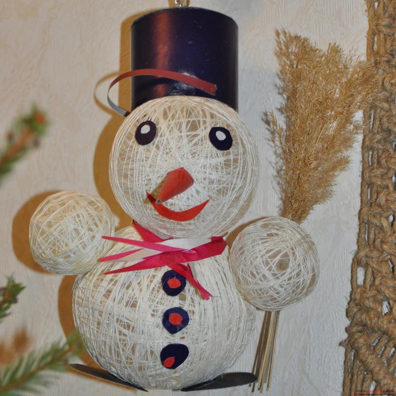 - Le fil est à nouveau utilisé. Cette fois, c'est le cou du bonhomme de neige artisanal qui est mis en avant. Nous avons déjà une image complète. Mais il est nécessaire de le décorer.