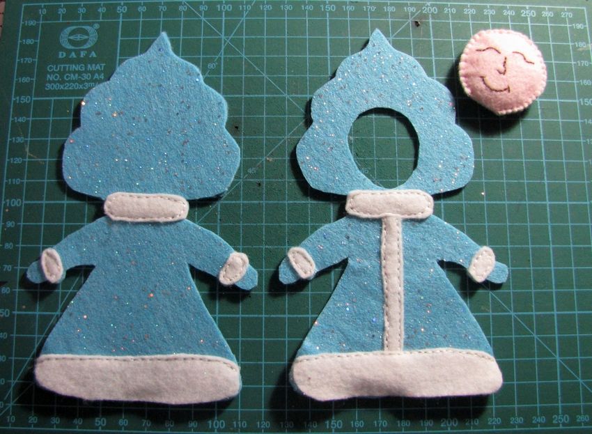 En plus de la demoiselle de neige volumétrique, vous pouvez la dessiner et la peindre avec de la peinture ou des feutres, puis y coudre des décorations supplémentaires sous forme de flocons de neige et d'ornements.
