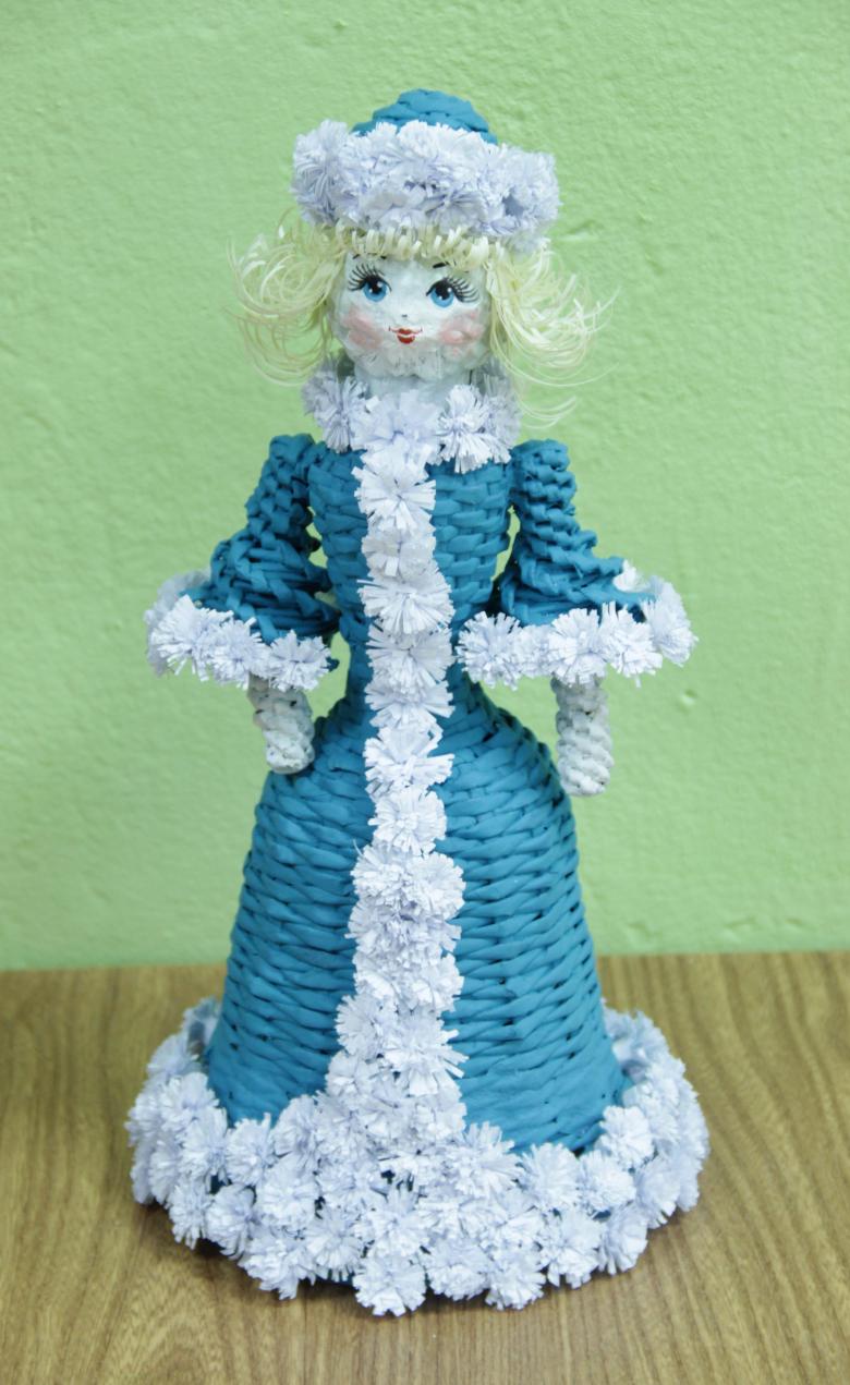 Pour réaliser cette vierge des neiges, vous aurez besoin d'un rouleau de fil ou de bandes découpées de papier bleu. Il suffit de les attacher ensemble à la manière d'une vieille poupée slave, d'ajouter une base en fil de fer pour maintenir la construction, ou de fixer la Vierge des neiges sur du papier.