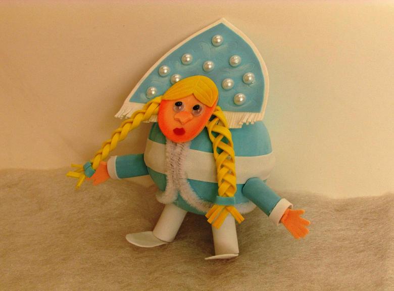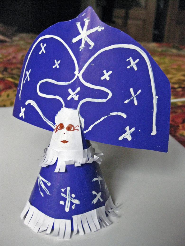 Une fois que vous avez terminé la peinture, les patchs et les extras, il est temps d'assembler la jeune fille des neiges. Vous pouvez faire des manches avec le même papier que les bras, et le visage peut être peint comme un portrait. Sur la tête, vous pouvez également ajouter un ornement sous la forme d'un diadème ou de notre coiffe féminine russe traditionnelle.