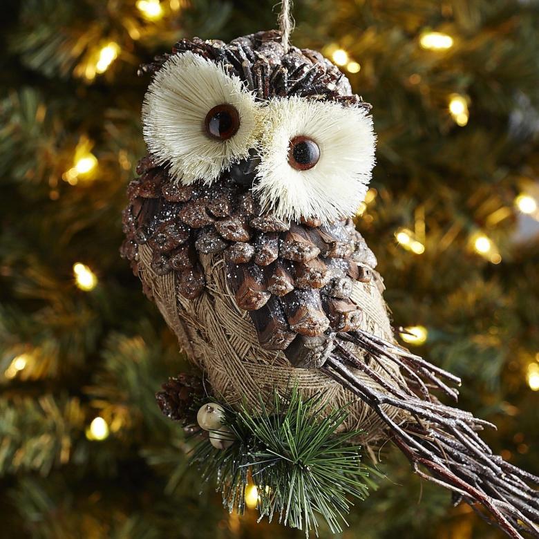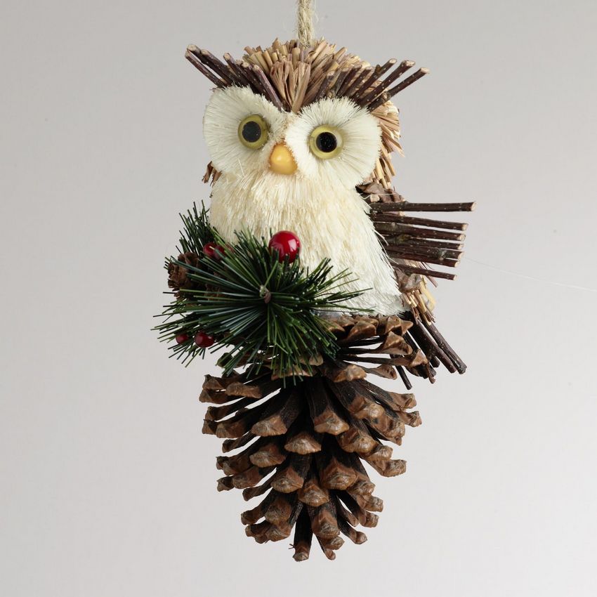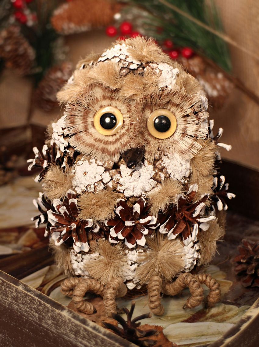 - Lorsque le corps est terminé, collez un grand cône évasé sur la tête. Pour que la pièce ressemble davantage à un hibou, de petits cônes peuvent être attachés à la tête. Fixez les pommes de pin sur les côtés.
