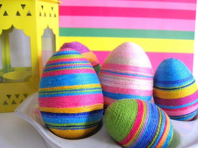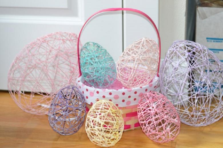 Pour un œuf de Pâques, un ballon est gonflé, enfilé dans un tube de colle à l'aide d'une aiguille et d'un fil et enroulé dans la colle. Lorsque la colle sèche, le ballon est dégonflé, laissant un contour de fil. Mettez un lapin de Pâques à l'intérieur et décorez selon votre design !