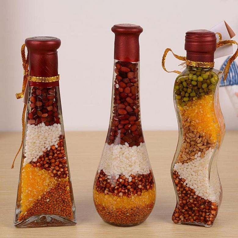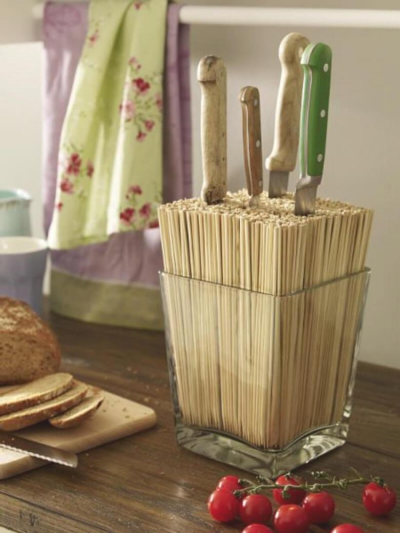 Dans le second cas, un vieux vase ou un bocal ordinaire peut s'avérer utile. Placez-y des brochettes en bois, des bâtons de cocktail, des brindilles soignées, de longues pâtes droites. Les petits couteaux maintiendront le riz, le millet et les autres céréales en place.