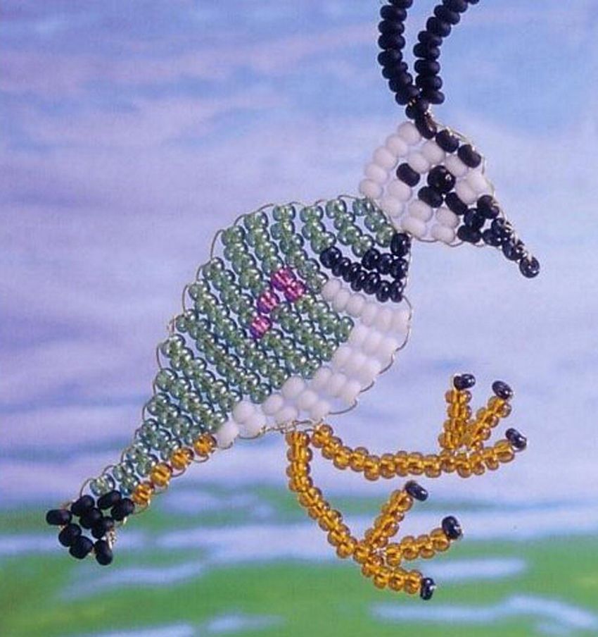 - Le corps de la libellule doit être terminé, car la partie de la queue vient ensuite. Mais ici la densité est réduite. Puis rangée 7 de 4 perles grises, rangée 8 de 3, rangée 9 de 21 avec 2 pièces de tissu ;