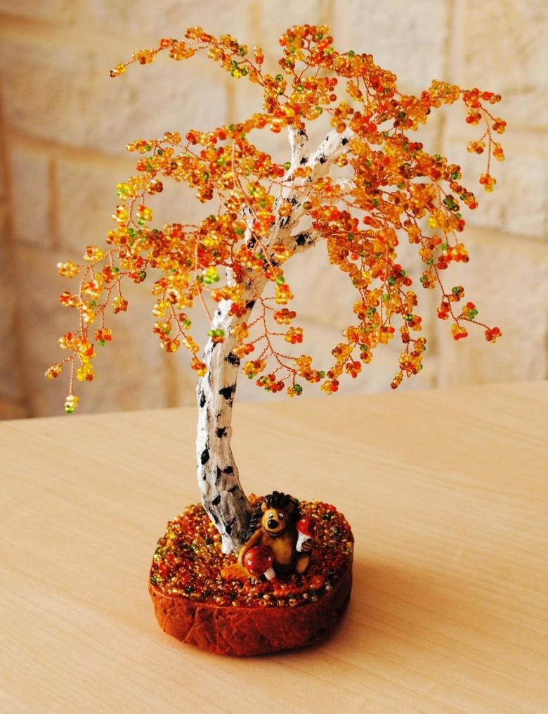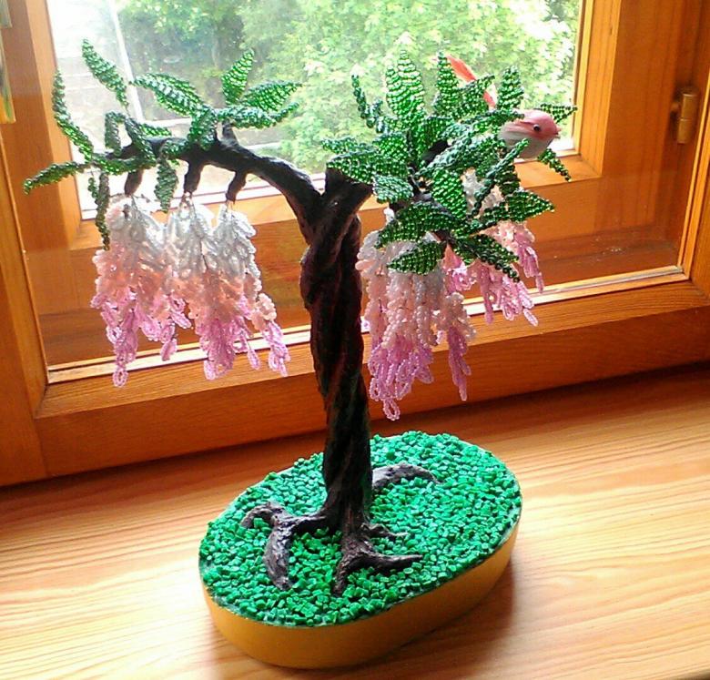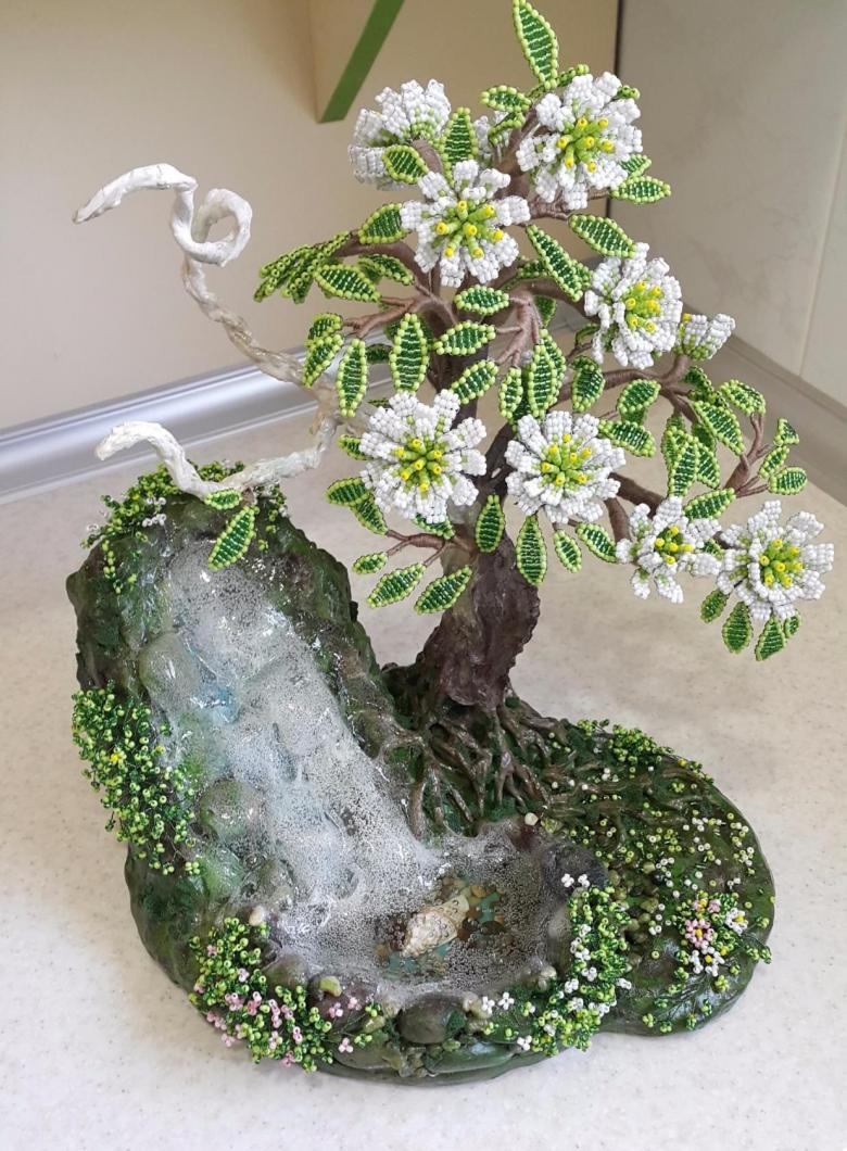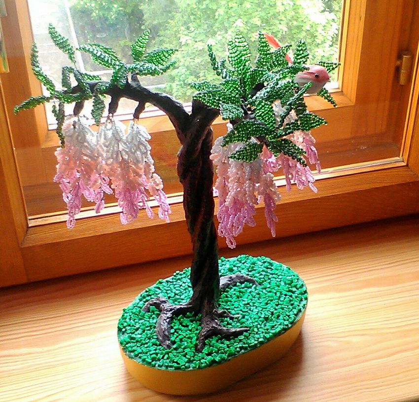 Important : le travail des perles prend un peu de temps pour sécher. Lorsque le produit est devenu sec, une imitation du sol est créée, la présence d'un véritable tronc d'arbre. La peinture est utilisée. La fixation se fait avec du vernis.