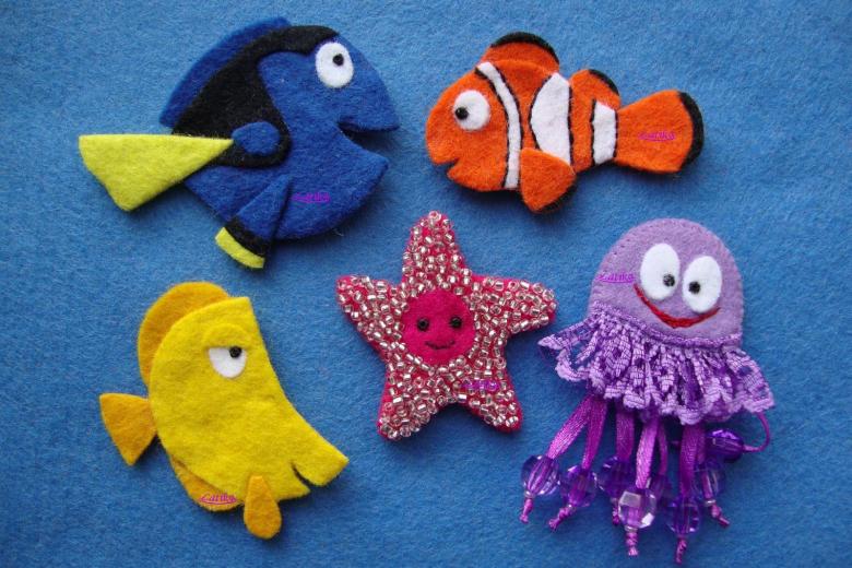 Les artisans fabriquent d'étonnants bijoux en feutre : boucles d'oreilles, bracelets, colliers. Les véritables chefs-d'œuvre sont les broches en forme de fleurs tridimensionnelles, les pendentifs en perles, les épingles à cheveux, les badges. Les insectes tels que les libellules, les papillons et les coléoptères sont populaires, ainsi que les créatures marines telles que les dauphins, les coraux, les poissons aux couleurs vives et les méduses.