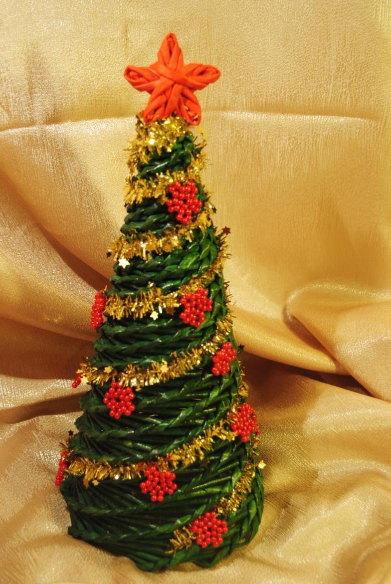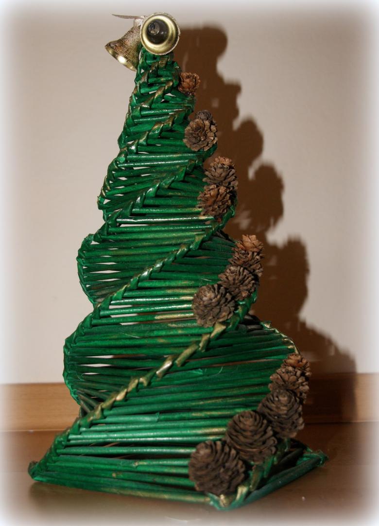 - Chaque nouvelle rangée est déplacée au centre de la précédente, le travail est effilé. 1 à 2 cm avant l'extrémité du cône, la forme doit être retirée, car le tissage s'y appuie très fortement. Pour ce faire, il faut couper et coller vers l'intérieur la liaison des poutres au bas de l'arbre de Noël.