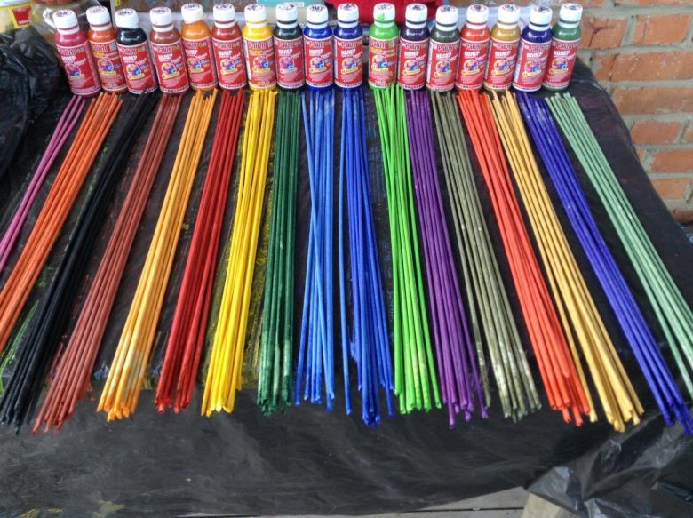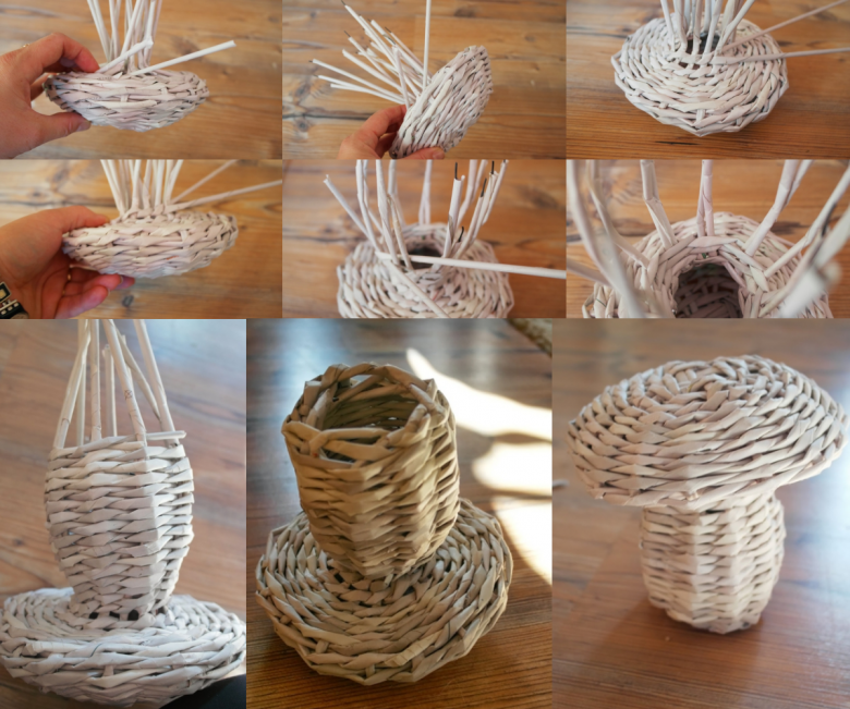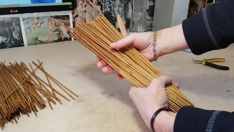 Les tiges devront être allongées au fur et à mesure que vous travaillez. Pour des raisons de commodité, les extrémités des tubes doivent être de diamètres différents pour pouvoir s'emboîter les unes sur les autres. Faites couler de la colle dans la partie la plus épaisse et insérez l'extrémité la plus fine du tube suivant. Humidifiez la vigne en papier avant de travailler. Pour ce faire, 30 à 60 minutes avant le tissage, il est aspergé d'eau à l'aide d'un pulvérisateur. Cela confère aux brindilles élasticité et flexibilité.