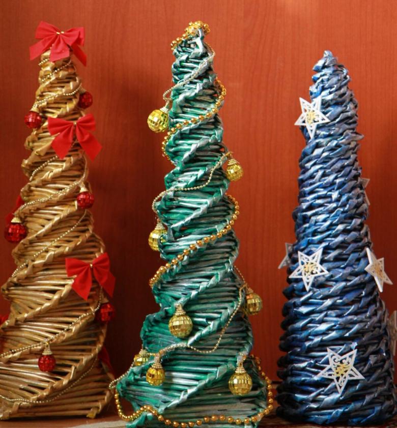 Les jouets miniatures et les petits bonbons peuvent facilement être attachés aux enroulements en spirale avec de la ficelle ou de la colle. Un tel arbre de Noël peut se tenir sur ses pieds dans des bottes, ou être "planté" dans un pot. Un chapeau rouge avec un bob ou une cloche est souvent placé sur le dessus.