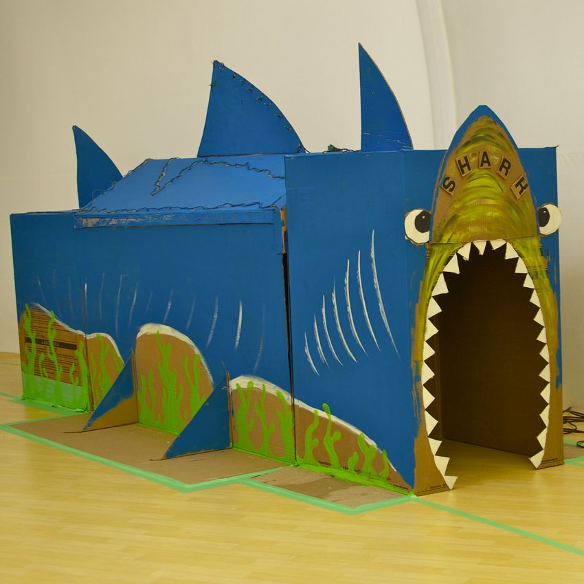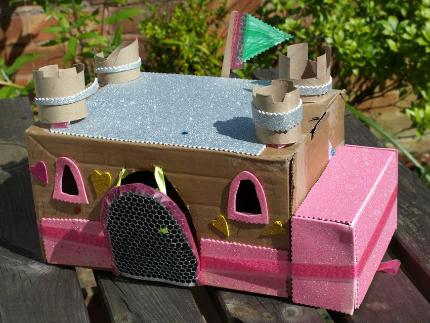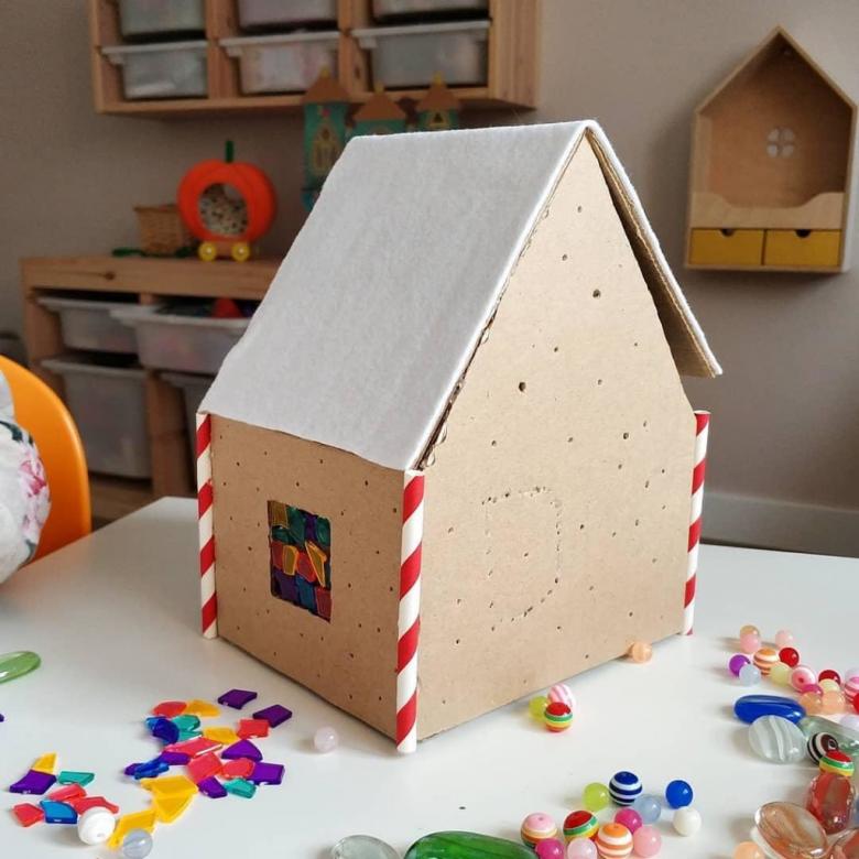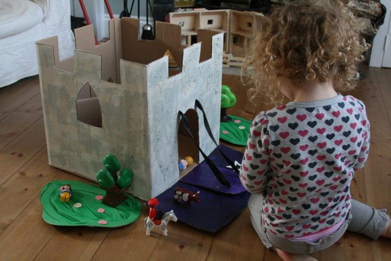Une grande boîte, provenant par exemple d'un appareil électroménager, est idéale pour construire une petite maison ou un château où l'enfant peut faire des choses en toute intimité. Des fenêtres, des portes, un toit et d'autres éléments architecturaux peuvent être ajoutés à la maison.