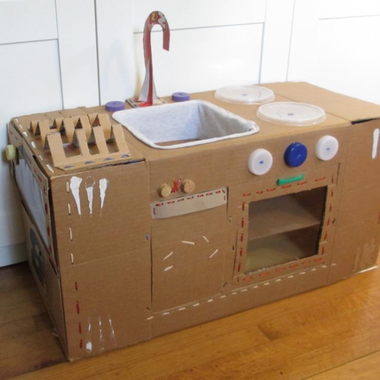 Vous pouvez fabriquer une cuisine de poupée à partir de boîtes en carton adaptées. Assez simple à réaliser : un réfrigérateur, une plaque de cuisson, un ensemble de cuisine. Si vous le souhaitez, vous pouvez également installer une machine à laver.