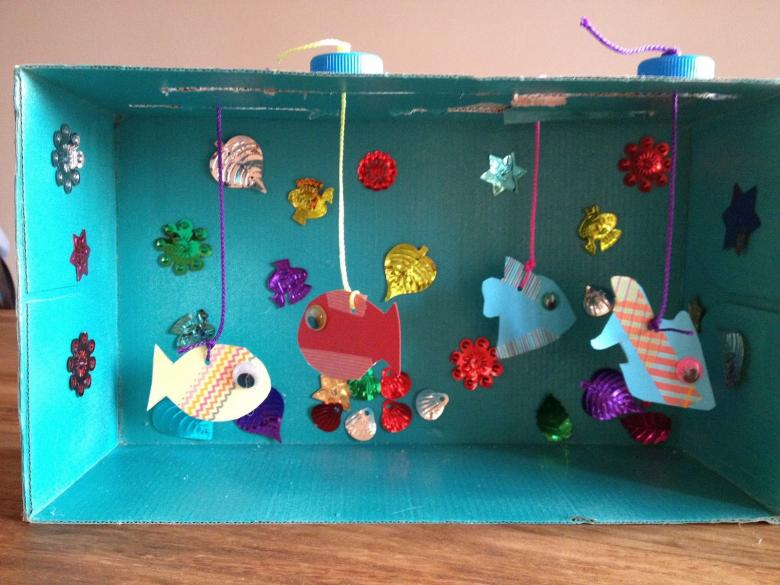 - Décorez l'"aquarium" avec différentes décorations : pâte à modeler, paillettes, papier de couleur, etc ;
