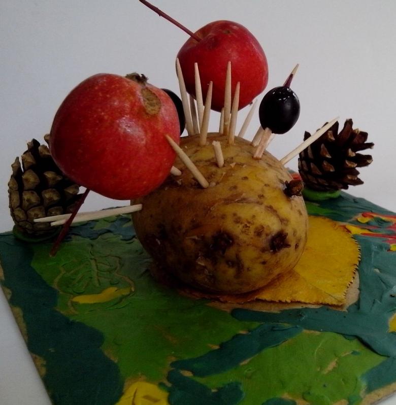Un hérisson qui accumule de la nourriture pour l'hiver est particulièrement drôle. Comme support, vous pouvez prendre une feuille d'érable ou de tout autre arbre. Pour le hérisson sans pommes de terre, vous pouvez utiliser une autre version avec du gruau de sarrasin. Les aiguilles sont faciles à réaliser en pressant le sarrasin avec la main.