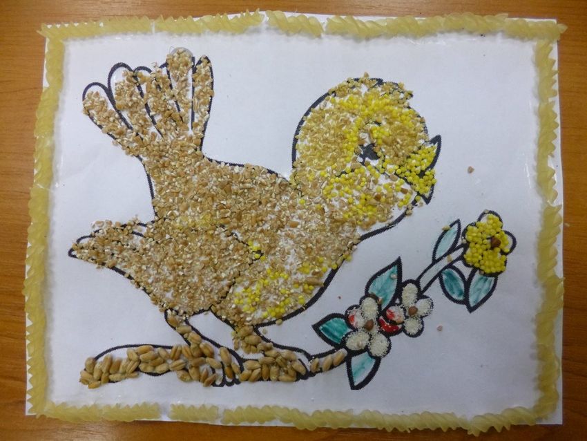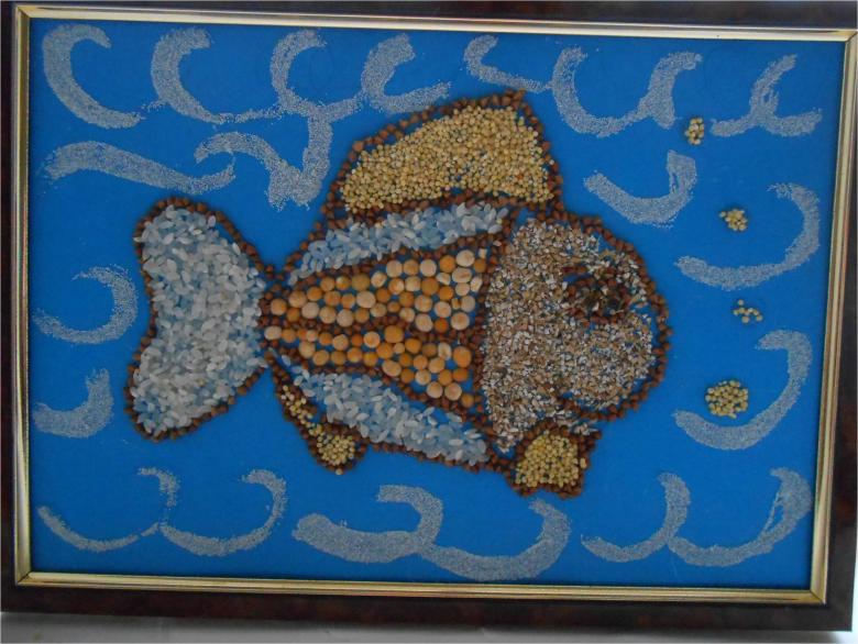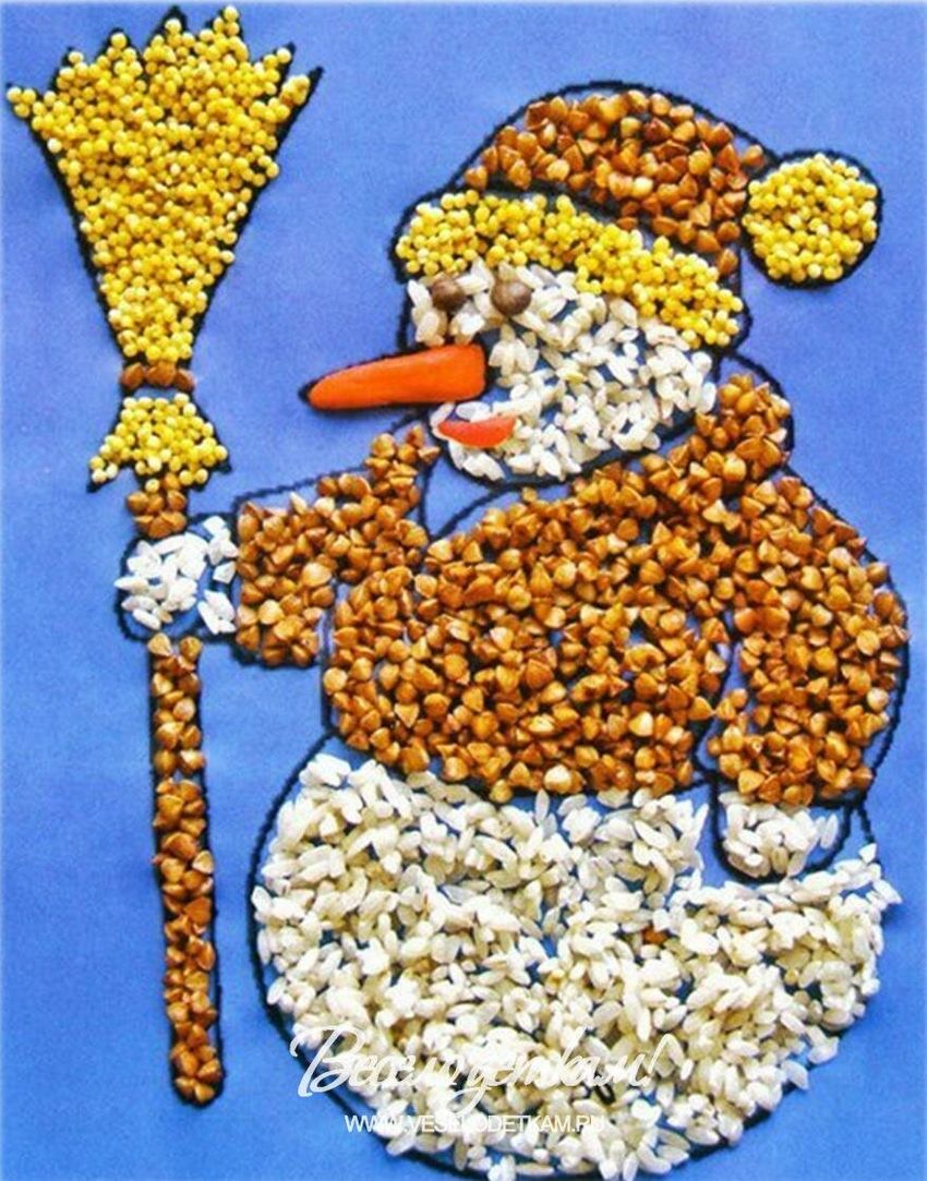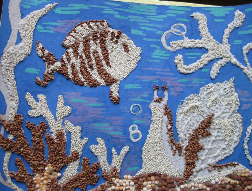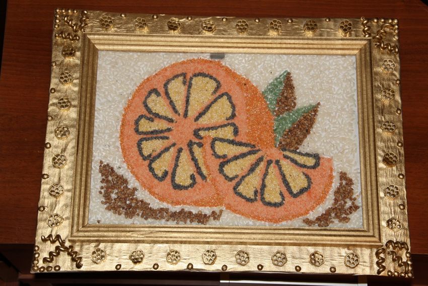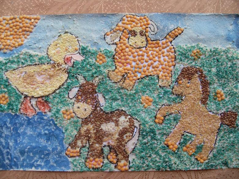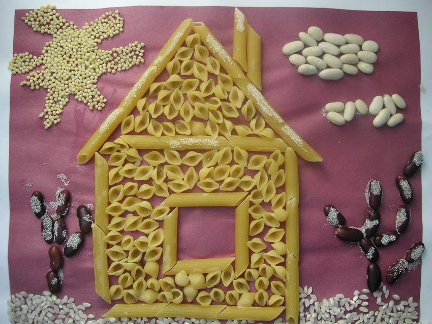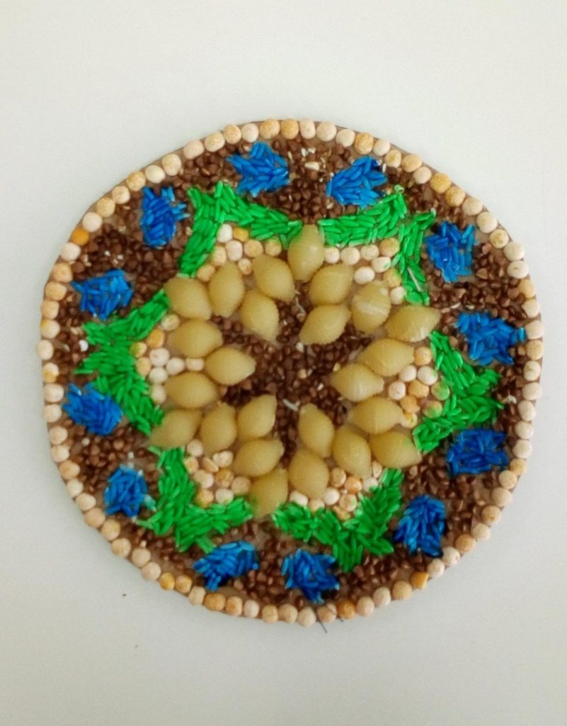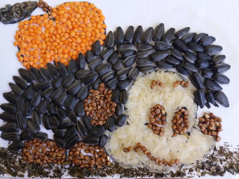 Cette décoration murale est un excellent exemple de bricolage à base de céréales pour les enfants de 4-5 ans. L'intrigue peut être trouvée sur Internet ou inventée par vous-même. Il est préférable d'utiliser des céréales de tailles, de formes et de couleurs différentes.