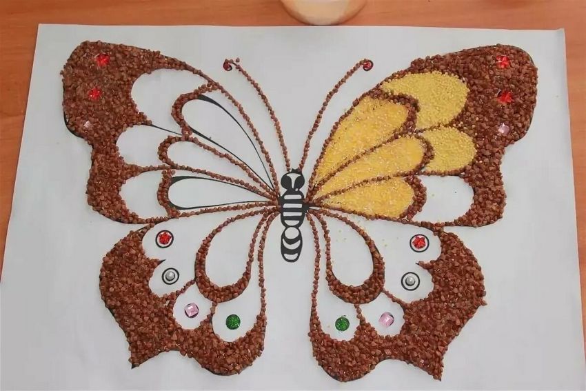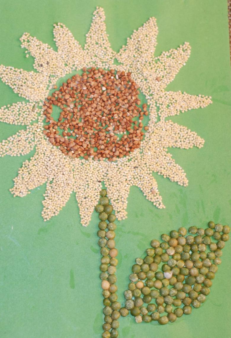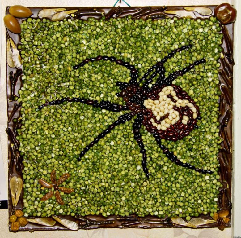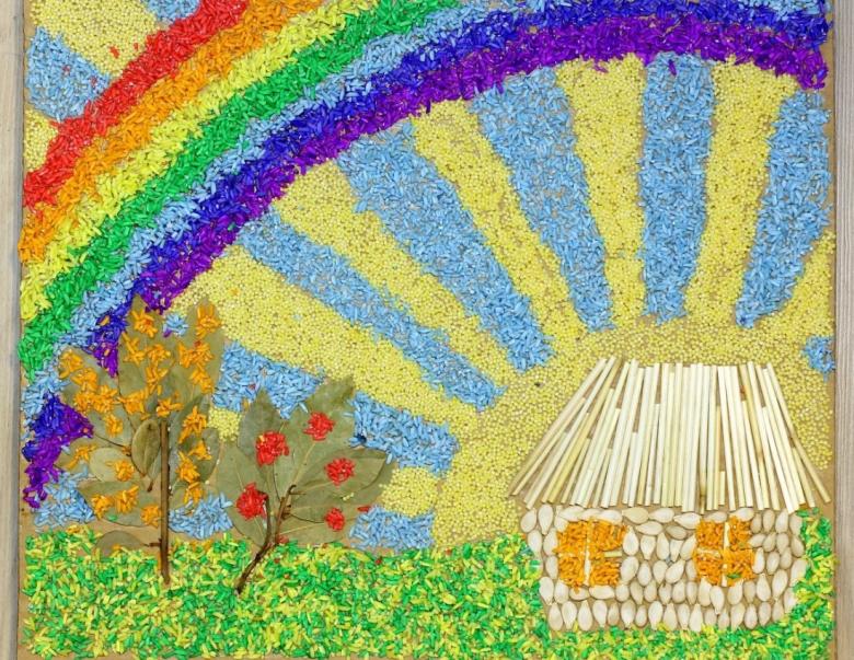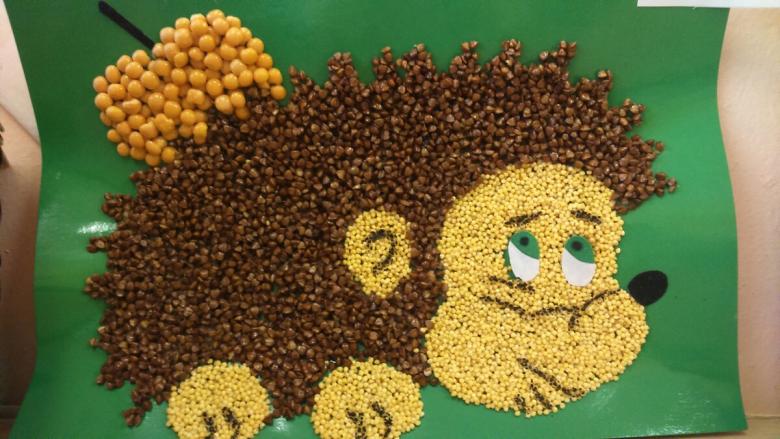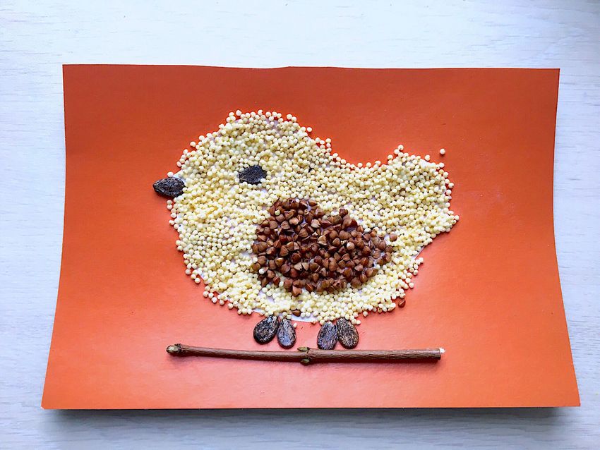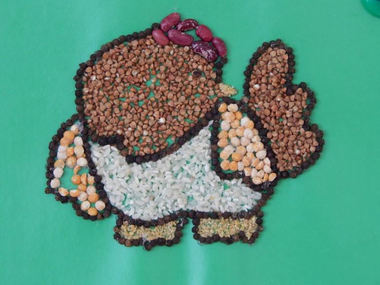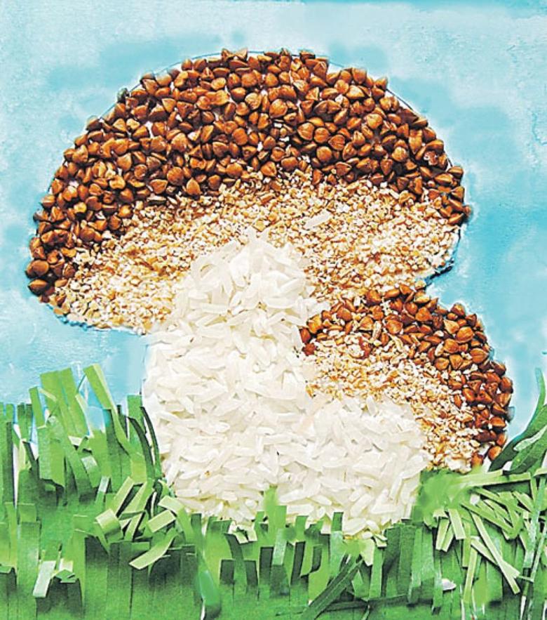 Cette décoration murale est un excellent exemple de bricolage à base de céréales pour les enfants de 4-5 ans. L'intrigue peut être trouvée sur Internet ou inventée par vous-même. Il est préférable d'utiliser des céréales de tailles, de formes et de couleurs différentes.