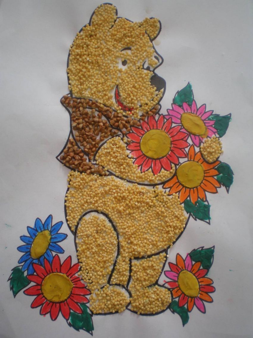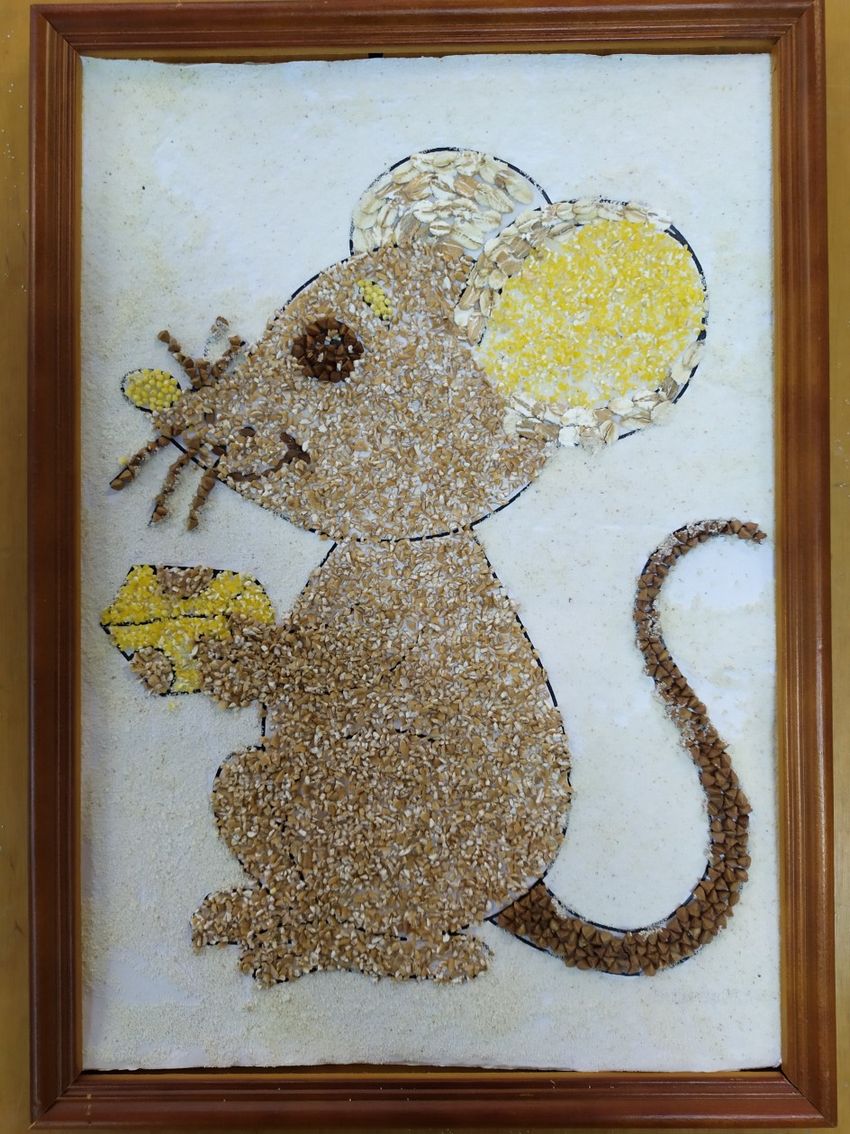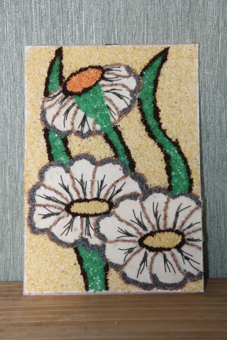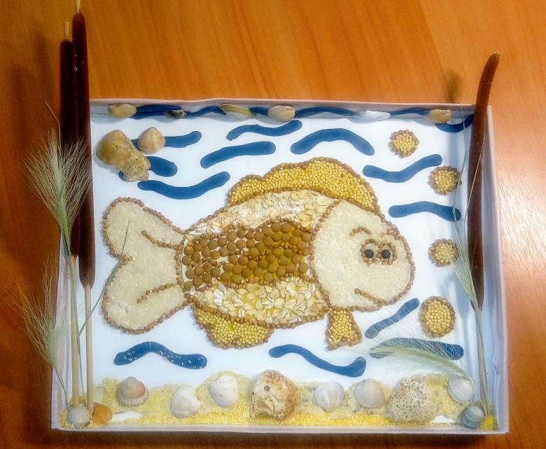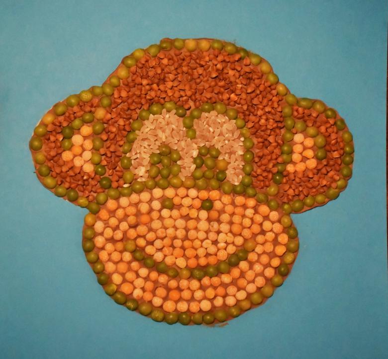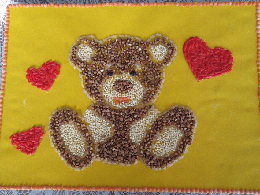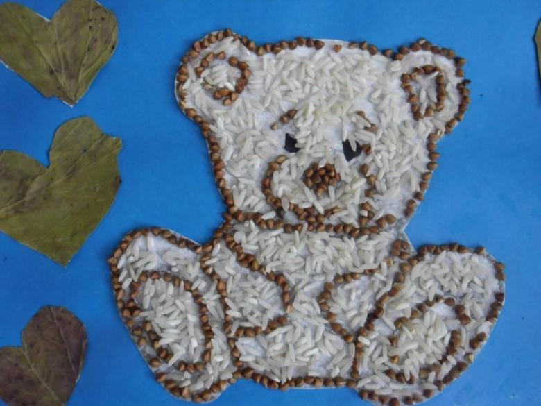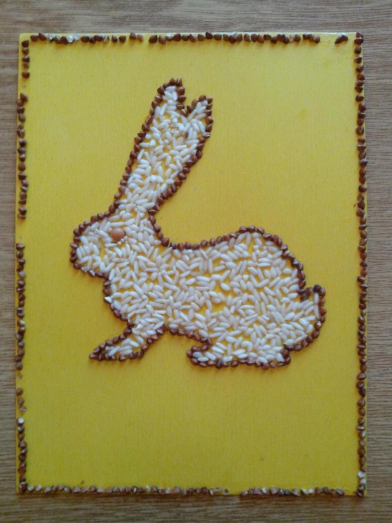 Cette décoration murale est un excellent exemple de bricolage à base de céréales pour les enfants de 4-5 ans. L'intrigue peut être trouvée sur Internet ou inventée par vous-même. Il est préférable d'utiliser des céréales de tailles, de formes et de couleurs différentes.