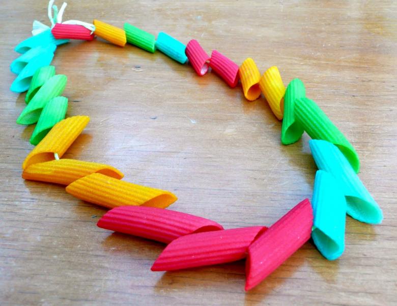 Même un enfant d'âge préscolaire sera capable de créer une telle décoration. L'artisanat est simple : les pâtes sont teintées de différentes couleurs et enfilées sur une ficelle.