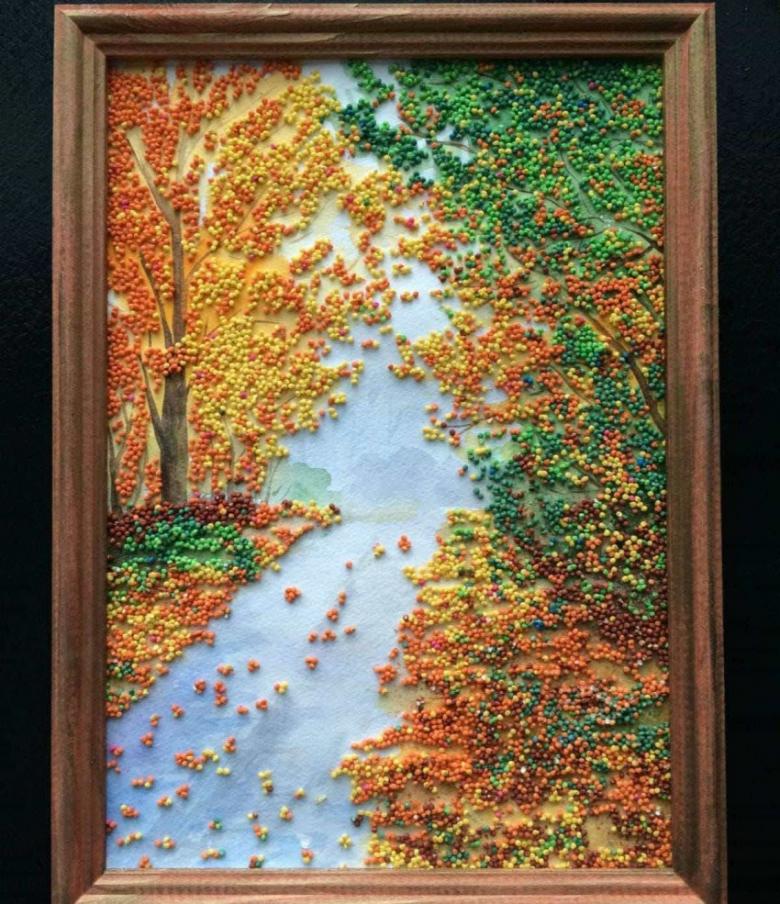 - Répétez l'étape. Répétez l'étape 2 et l'étape 3 pour chaque partie de l'appliqué. 3 pour chaque partie de la demande. Les grains doivent couvrir toute la surface du panneau. Pour renforcer l'effet visuel de l'œuvre, nous recommandons de mettre en valeur les fragments avec un contour de vitrail.