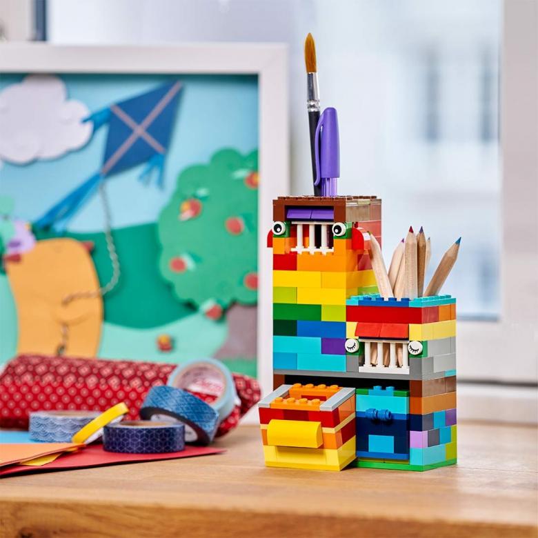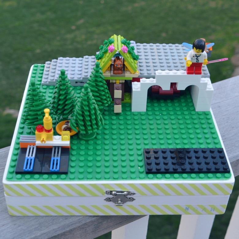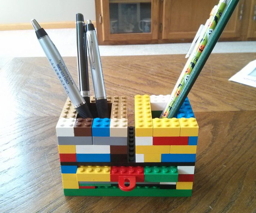 La chose la plus originale et pourtant la plus simple est une boîte de lego en forme de cube. Vous pouvez décorer cette boîte avec des couleurs différentes, ajouter une inscription à partir de parties colorées ou y coller des autocollants. Il fait non seulement un super support, mais aussi une boîte amusante pour y ranger de petits objets et des pièces.