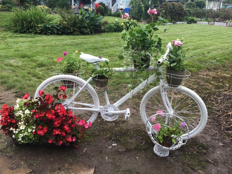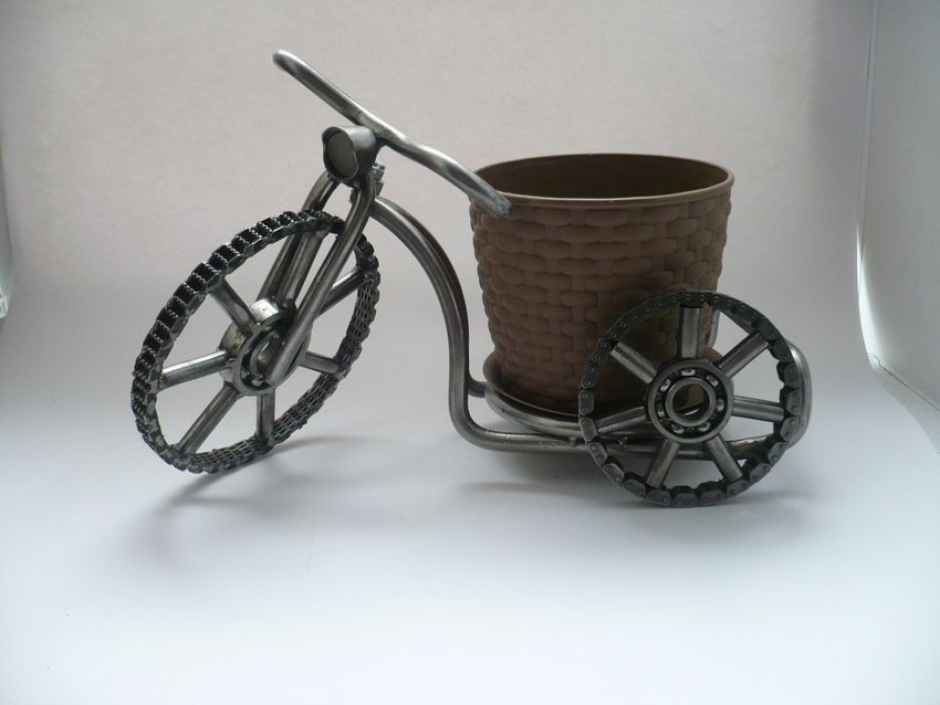 Vous pouvez utiliser les parties restantes pour créer un parterre de fleurs inhabituel. Il est formé en attachant un pot de fleurs à une structure métallique accessible laissée par un deux-roues.