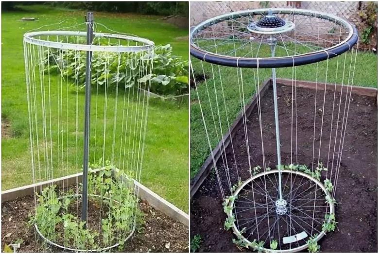 Les concombres pourront s'agiter autour des roues et se fixer au poteau pour recevoir un maximum de lumière solaire. Mais d'autres plantes qui peuvent pousser debout et s'enrouler autour des choses bénéficieront également de cette construction : raisins, haricots. Cependant, la hauteur des roues doit être confortable pour une récolte sans entrave.