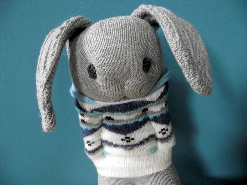 - Coupez l'élastique de la deuxième chaussette et découpez les oreilles en forme ou cousez ensemble deux morceaux triangulaires en arrondissant légèrement le coin pointu.