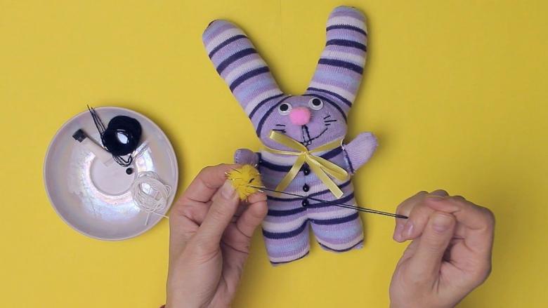 - Remplissez la partie inférieure de la chaussette avec la farce de votre choix, de sorte que le corps devienne rond et volumineux. Cousez fermement la partie inférieure avec un fil afin que la coupe ne se désagrège pas pendant l'utilisation.
