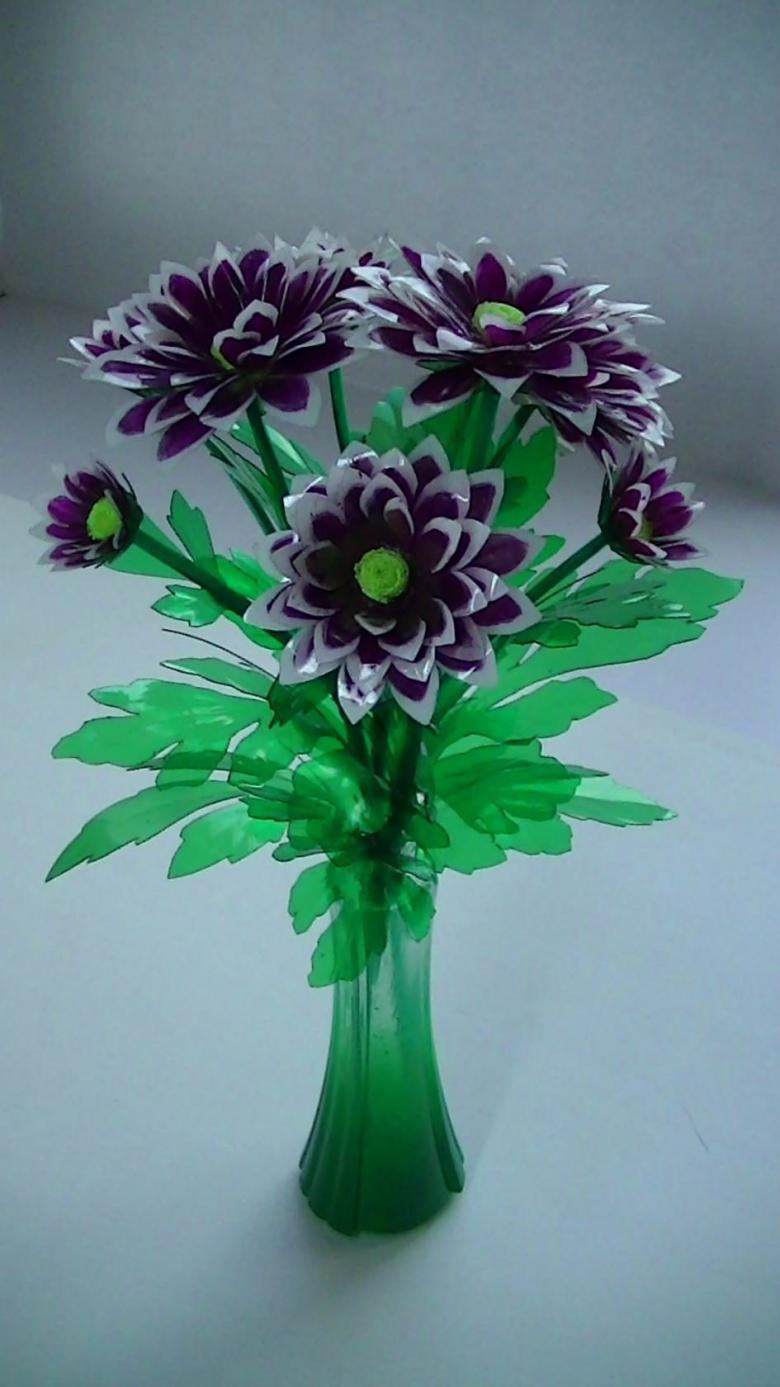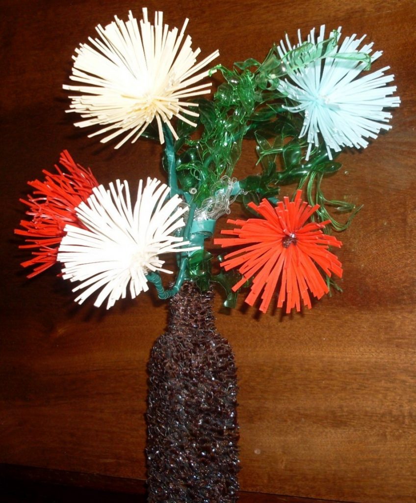 - De jolies marguerites peuvent être utilisées pour faire le haut de la bouteille. Pour ce faire, la partie étroite du col est découpée en pétales avant d'être enfilée. Les pétales sont pliés vers l'extérieur et peints de différentes couleurs si nécessaire.