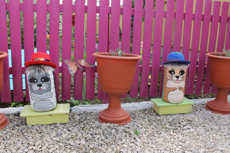 - Un âne attelé à un chariot fabriqué à partir de bouteilles en plastique décorera l'entrée ou le coin récréatif de la propriété du chalet.