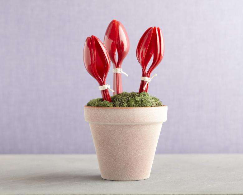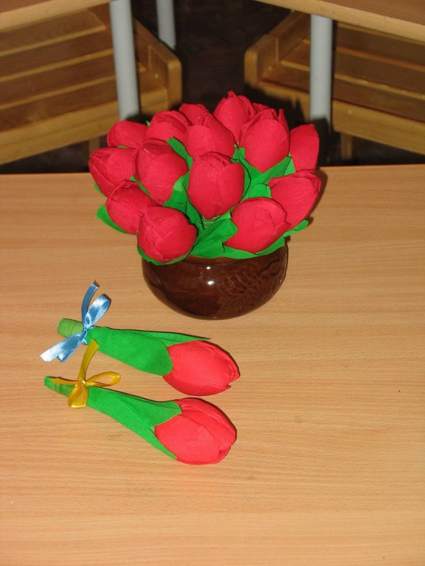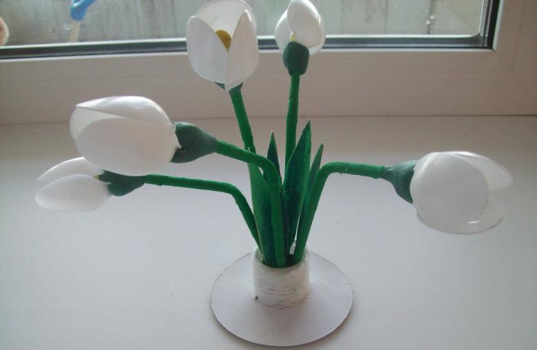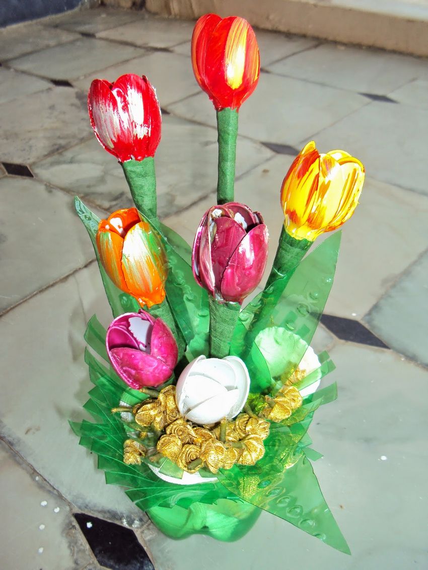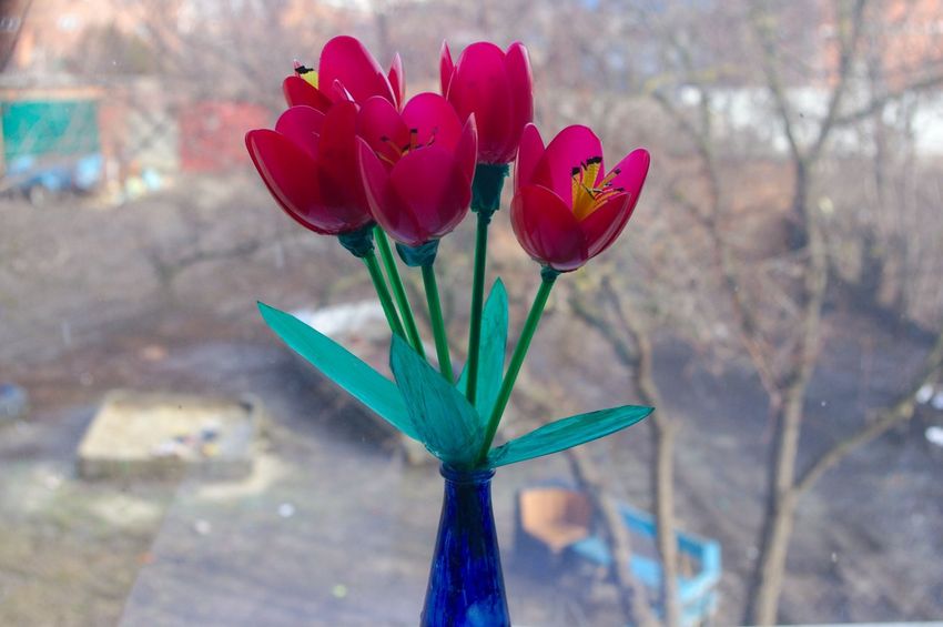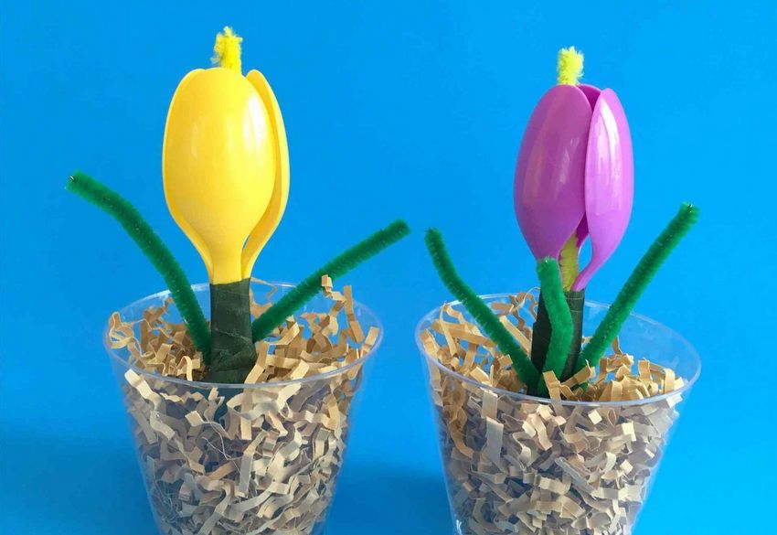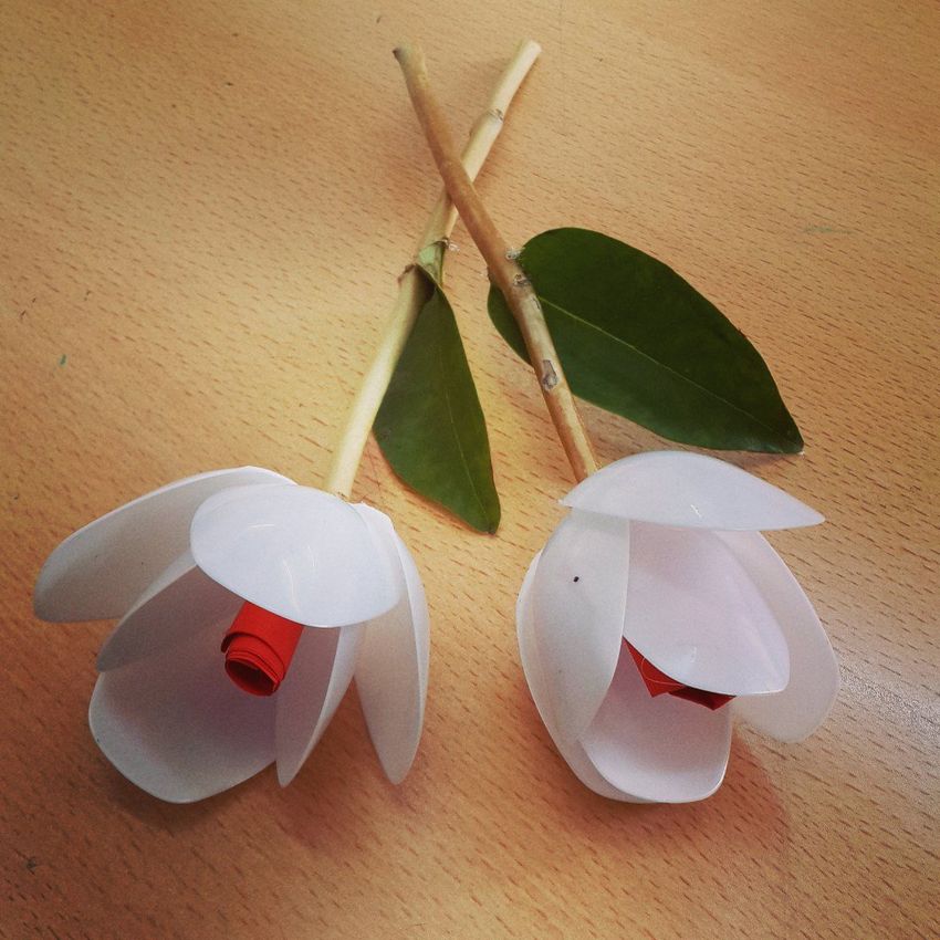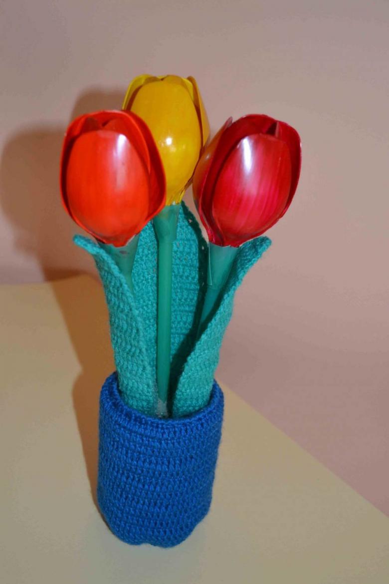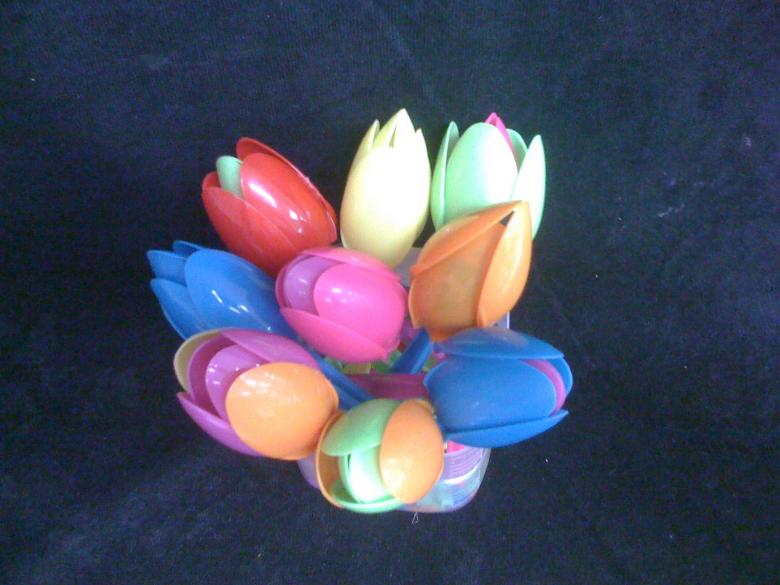 En sachant comment faire des fleurs avec des cuillères en plastique, vous pouvez vous sortir de toutes les situations où vous devez faire des décorations. Les plus simples sont les tulipes. Parce que leurs pétales ressemblent le plus possible aux rainures d'une cuillère. Il suffit de les courber légèrement et de les plier ensemble avec du ruban adhésif.