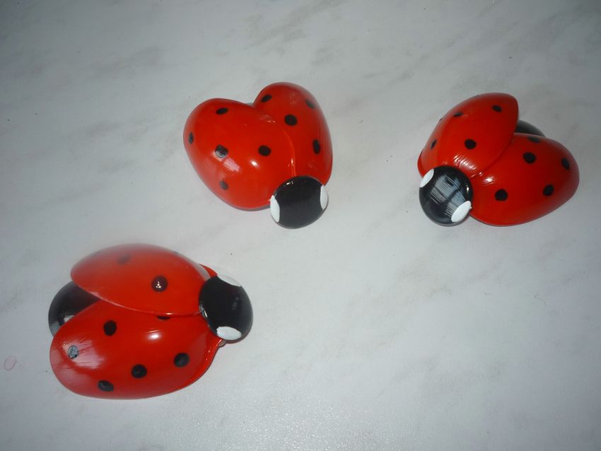 Pour les plus imaginatifs, vous pouvez, comme une coccinelle, faire des entailles pour les points noirs. Il suffit de prendre un objet chaud, métallique et rond et de le déposer à la cuillère à certains endroits, en appuyant légèrement. Cela crée des cratères qui peuvent ensuite être peints à l'acrylique sur une surface brillante.