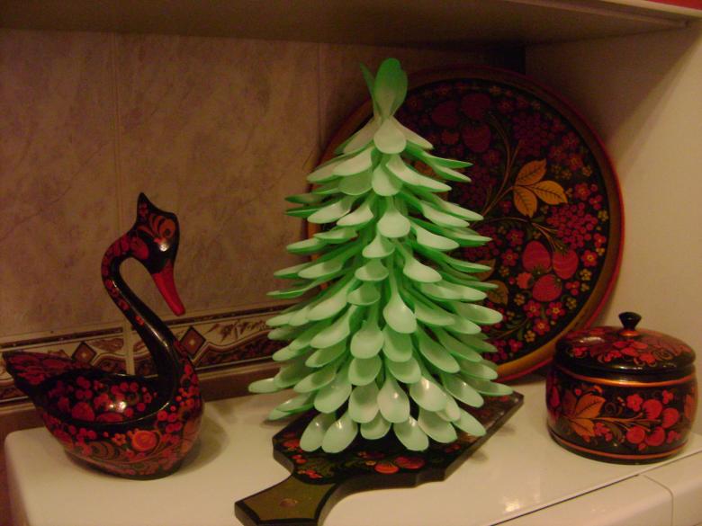 Créez un mini sapin de Noël sur le bureau de votre enfant. Vous pouvez le faire de deux manières. Dans tous les cas, vous avez besoin d'un bar. Dans la première méthode, fixez un cône en carton autour de la barre et collez des rainures en rangées régulières de bas en haut. Vous pouvez aussi prendre la même barre, couper les manches des cuillères sur la longueur correspondant à l'étage du sapin de Noël.
