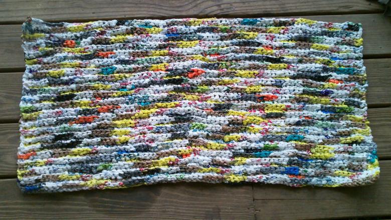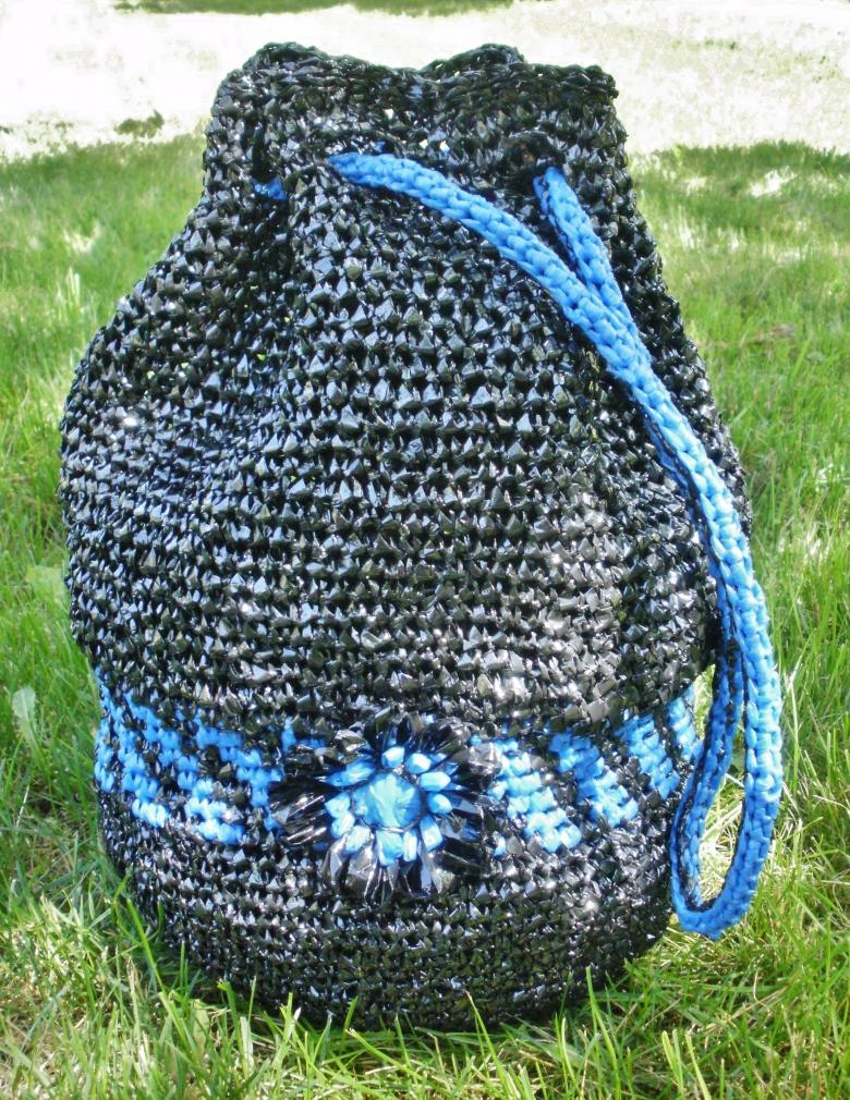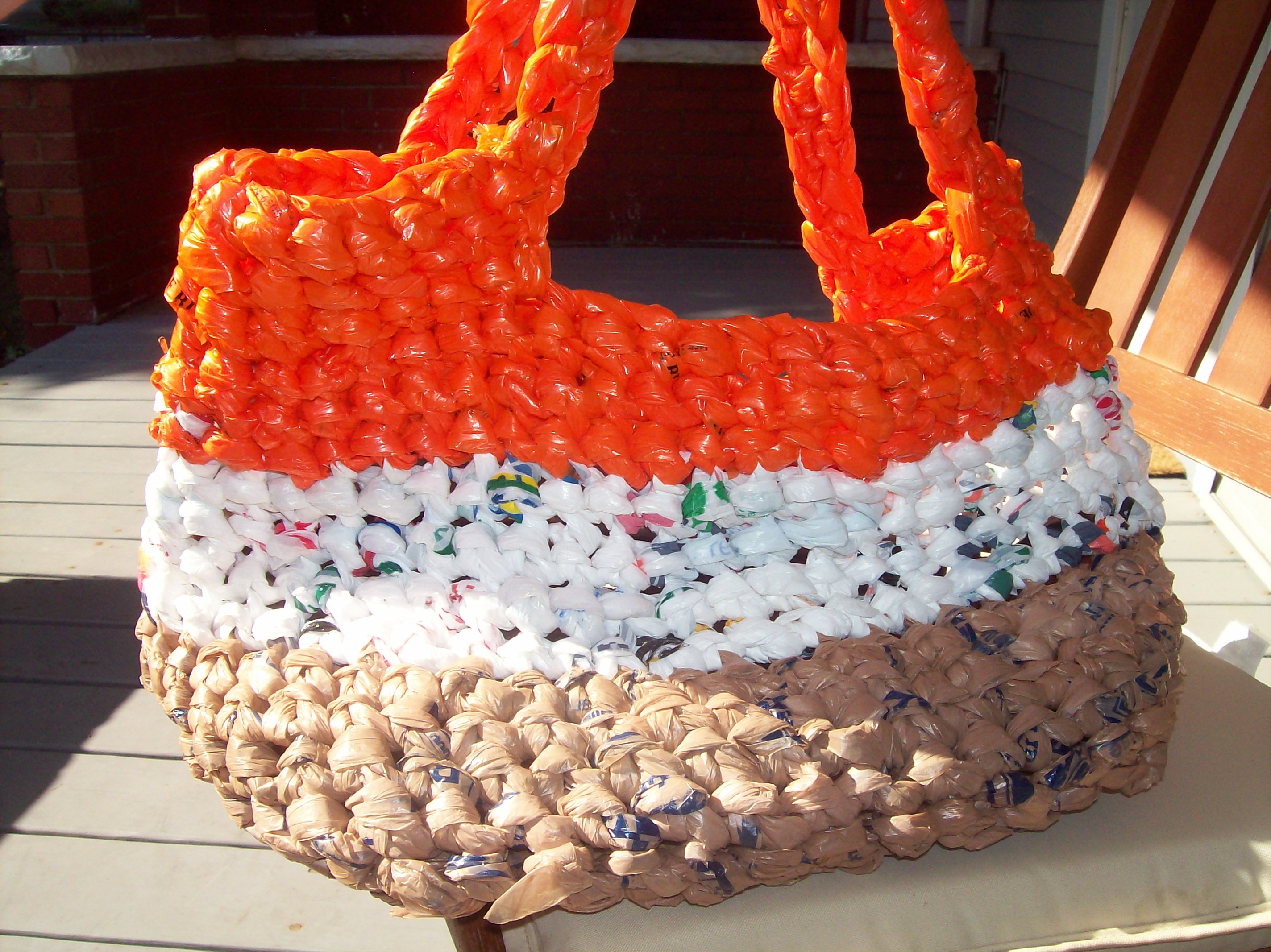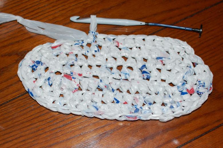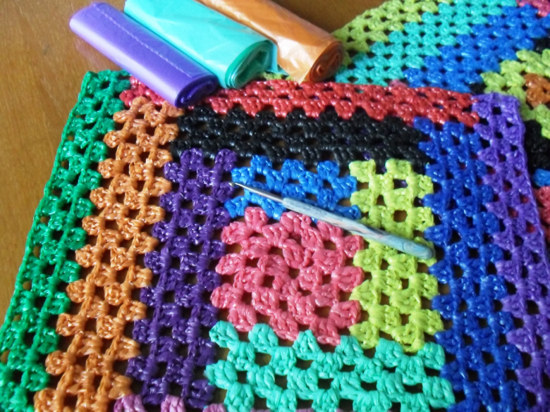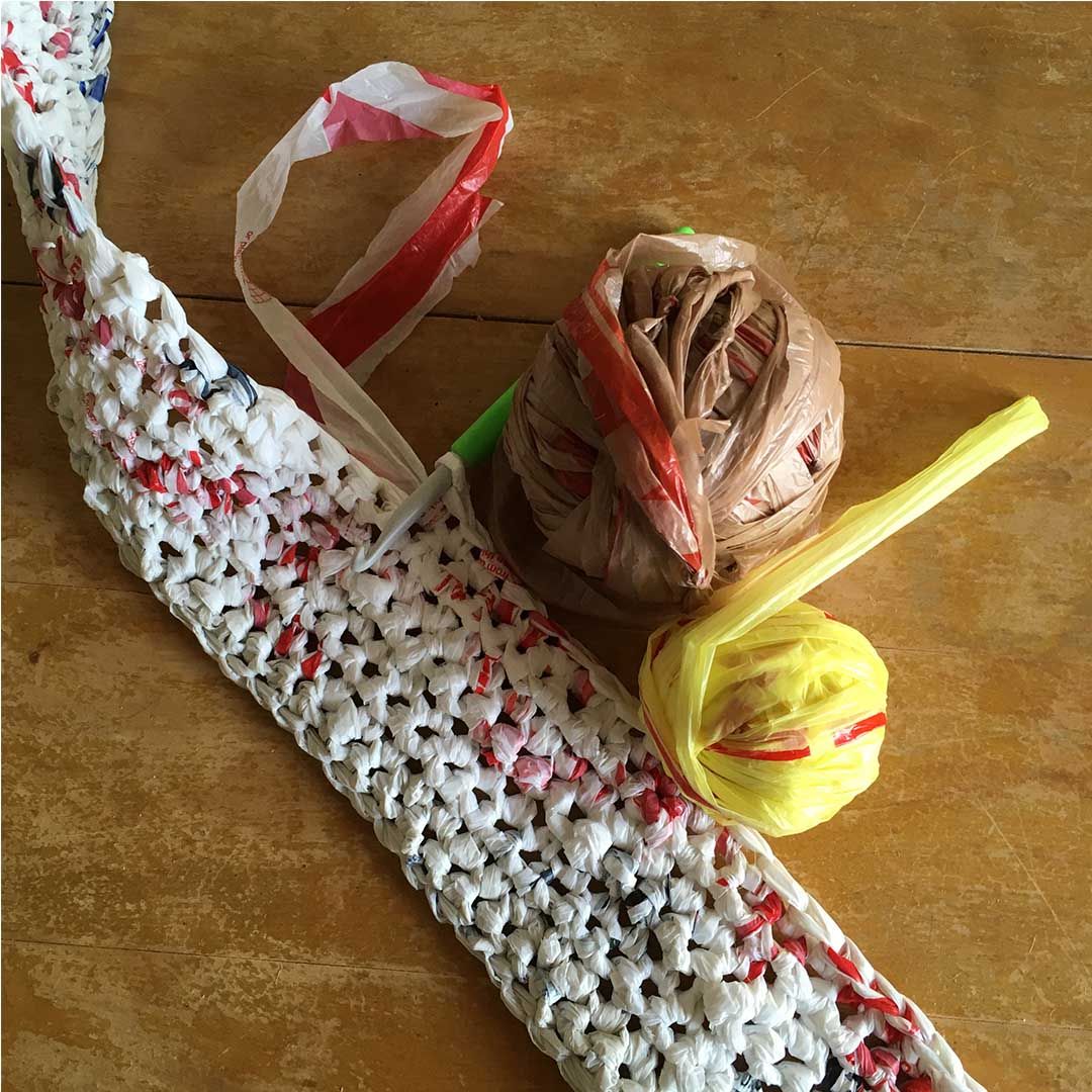 Les sacs poubelle peuvent être crochetés ou tricotés à la main. Les bandes de sacs découpés sont torsadées ensemble et formées en une boule, qui peut ensuite être utilisée comme substitut pratique et résistant au fil.