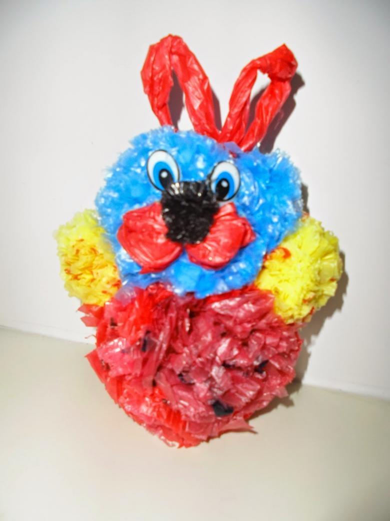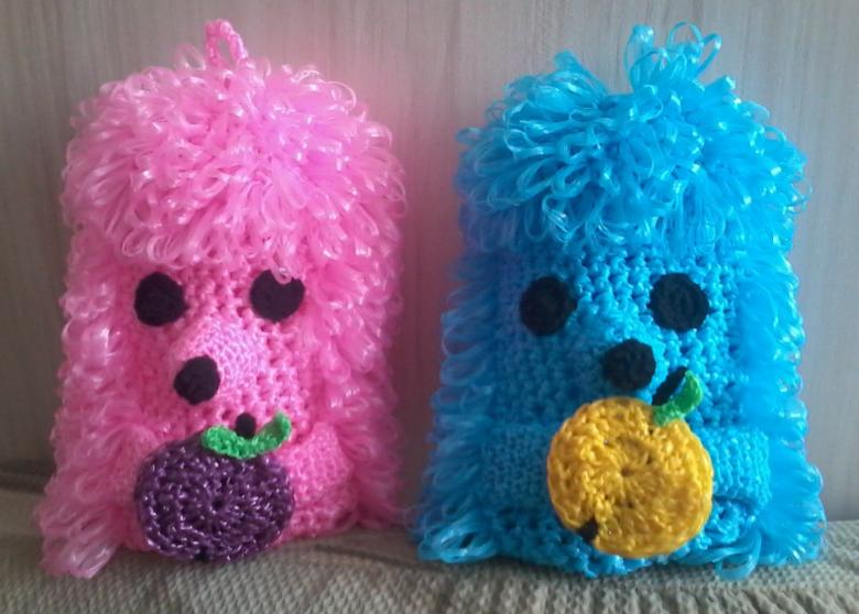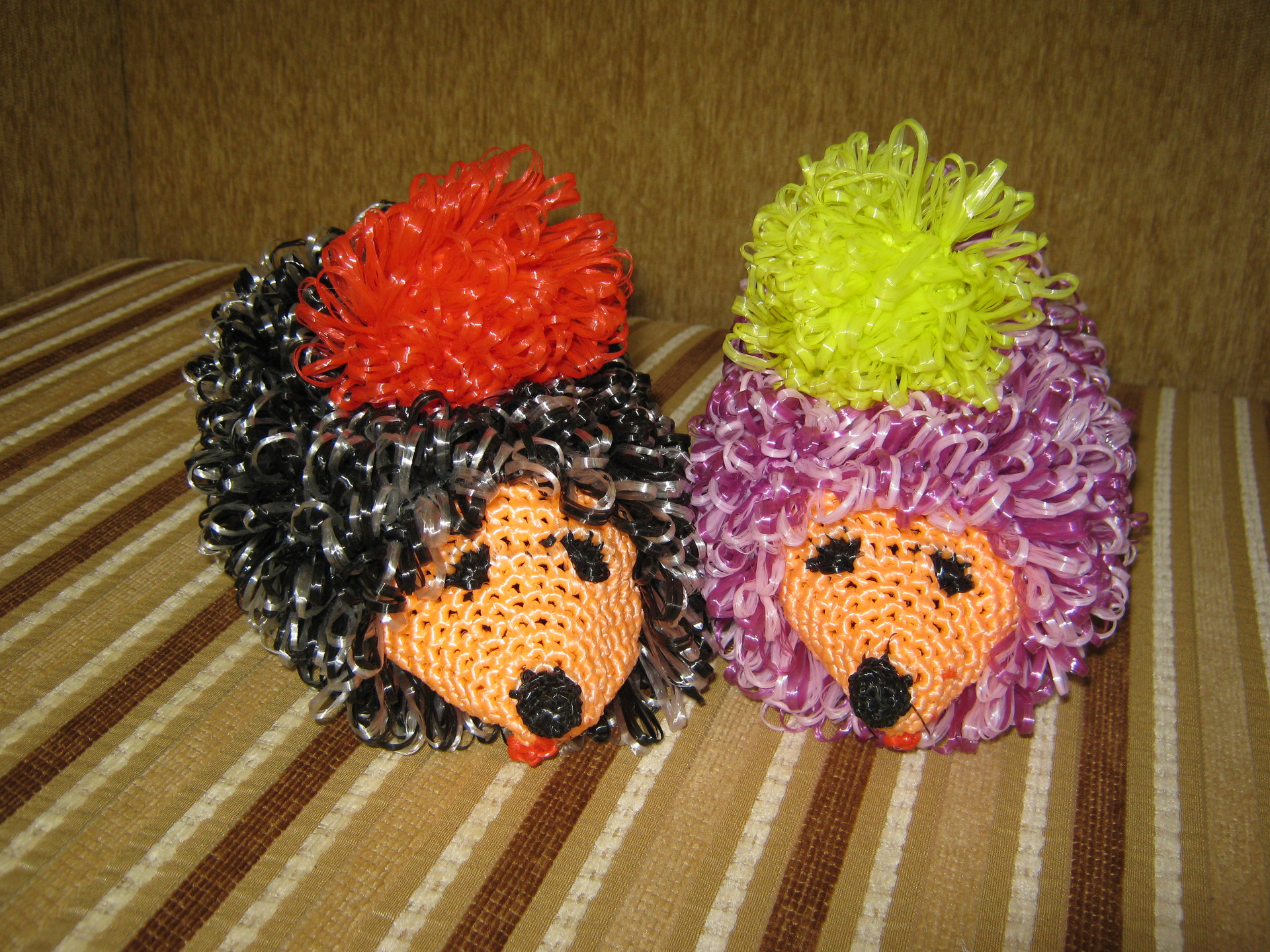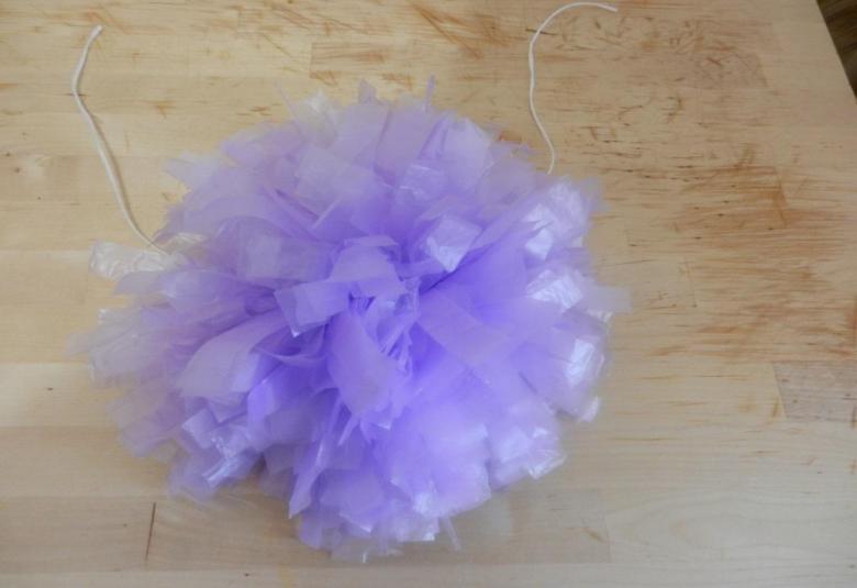 À l'aide de fines bandes découpées dans des sacs, des pompons de petite taille sont formés et divers éléments y sont collés. Il peut s'agir de becs, de queues et de pattes d'oiseaux, d'yeux amusants et d'autres éléments qui permettent de créer des oiseaux et des poissons, des chatons et des chiots, ainsi que des personnages de dessins animés.