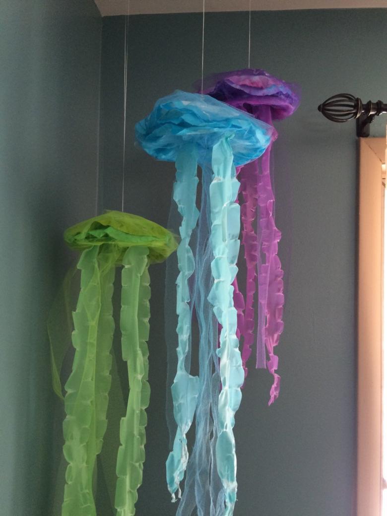 Si vous le souhaitez, vous pouvez peindre les tentacules des méduses avec une tache de peinture fluorescente pour créer un effet extraordinaire. Utilisez un pistolet à colle pour décorer le fond de la mer avec de la verdure et des algues artificielles, ou, si le récipient est grand, décorez le fond avec des galets.