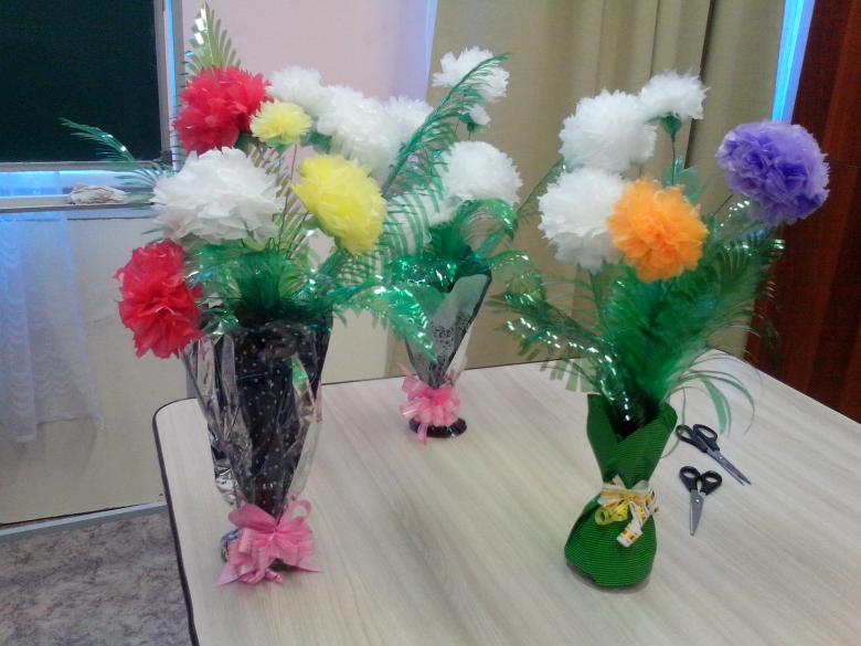 Sur un cadre de fil de fer imitant la forme du pétale fixez l'élément du paquet, pour cette base de fil de fer il suffit de chauffer. Les sacs en cellophane sont soigneusement formés à partir des nombreuses pièces que vous avez préparées et peuvent être de différentes couleurs pour les rendre plus réalistes.
