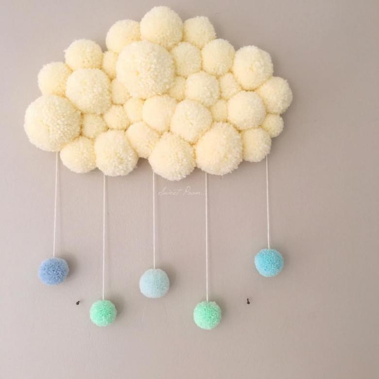 Donnez de l'allure à votre salon ou à votre chambre d'enfant avec votre grand nuage sur le mur. Pour réaliser un tel bricolage, il faut préparer 12-16 boules de peluche et quelques brins de fil de crochet.