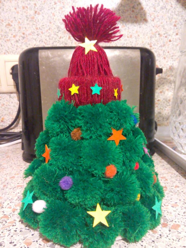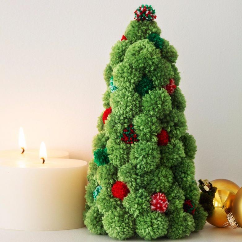 Les pompons duveteux peuvent être utilisés comme matériau pour créer un arbre de Noël. Pour la beauté enchanteresse de la forêt, un cône en carton et des pompons verts sont nécessaires. Il suffit de coller les boules duveteuses sur le carton ou de les coudre sur la base.