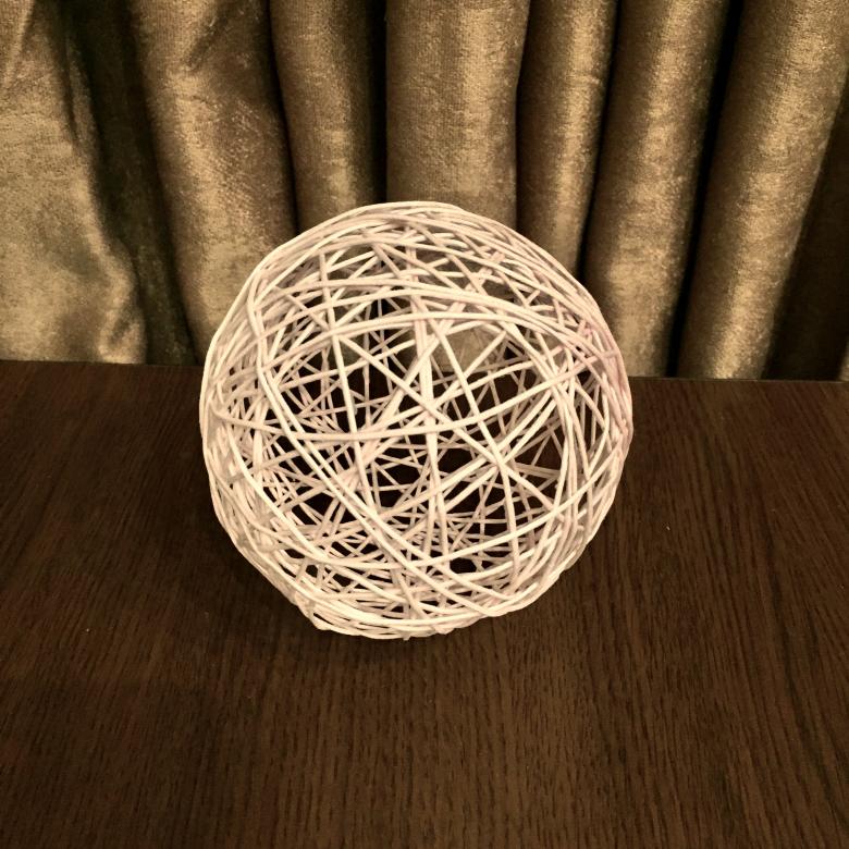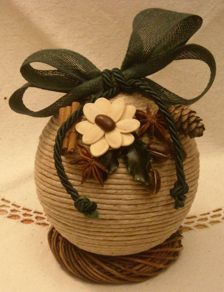 L'artisanat de la corde et de la ficelle sous forme de balles est un peu plus compliqué. Pour créer une telle merveille, vous avez besoin d'un ballon, qui doit être gonflé à la largeur requise. Comme pour le métier précédent, la base est enduite de colle, sur laquelle sont appliquées les bobines, mais dans ce cas, il peut y avoir des espaces entre elles, les bobines peuvent traverser la pièce dans n'importe quelle direction, en se chevauchant les unes les autres.