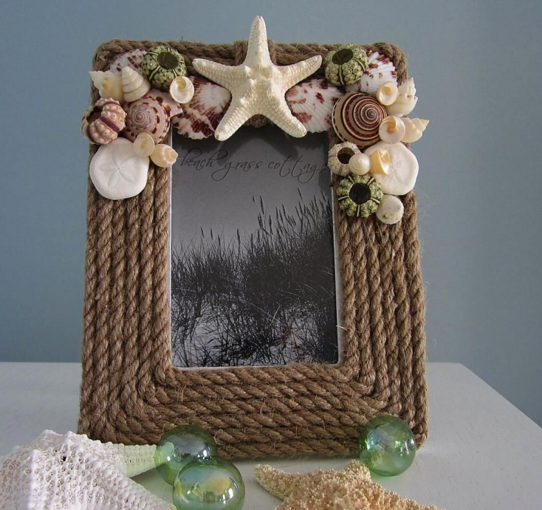 Des cadres très inhabituels pour les miroirs et les photos sont créés à partir d'une base en bois. Elles sont fabriquées de la même manière que les couronnes, sauf que la décoration peut être constituée d'objets plus grands ou de filigrane de ficelle fine.