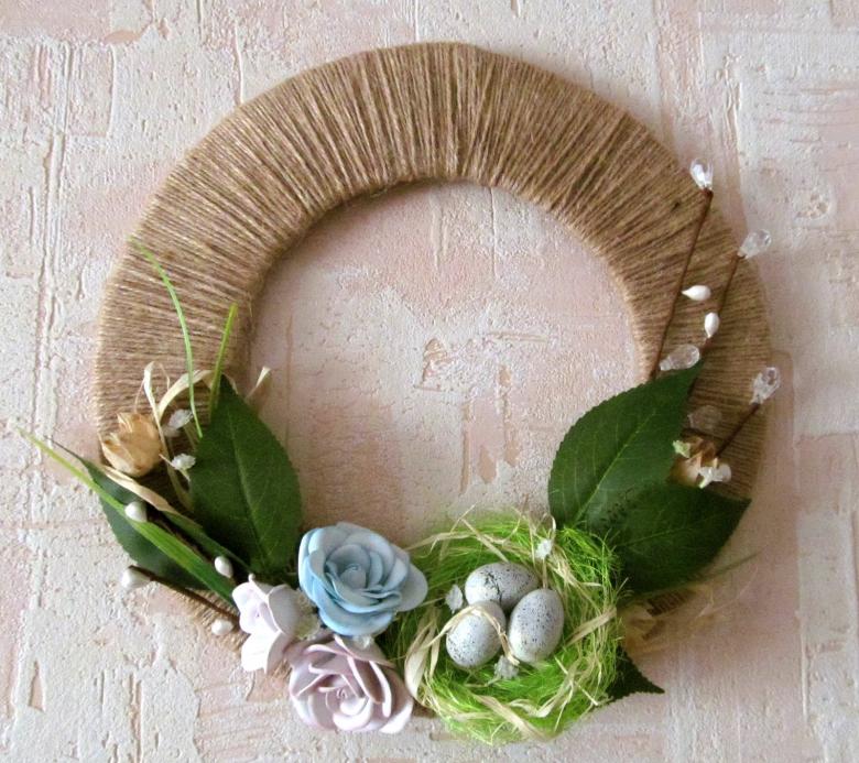 Une couronne de Pâques est créée de la même manière, en laissant de petites entailles pour placer les œufs peints. Les décorations comprennent des poussins en pom-pom, des fleurs et des cônes peints.