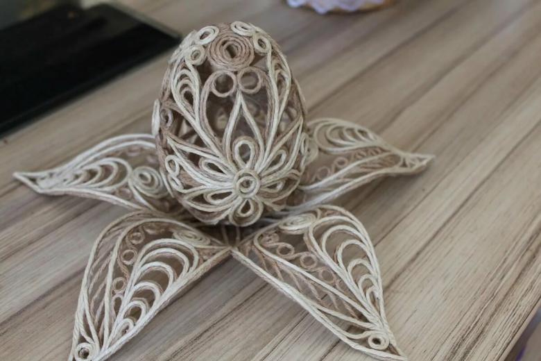 Un cadeau insolite peut être réalisé pour une fête de printemps éclatante en laissant un espace lors de l'enfilage, imitant une coquille brisée. Placez de l'herbe en laine ou en tissu vert, placez un poussin et des fleurs en pâte à modeler, mettez de minuscules branches de saule avec des bourgeons duveteux (ou leurs imitations) à l'intérieur du bricolage.