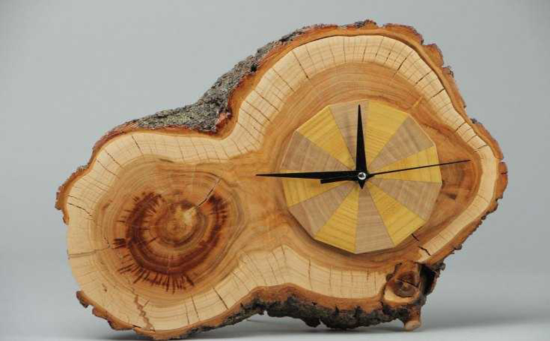 Une horloge murale est une autre option intéressante pour la décoration intérieure. Pour un tel bricolage, vous aurez besoin de 12 blocs de bois sciés d'environ le même diamètre. Chaque grume est soigneusement poncée et traitée avec une huile résistante à l'humidité.