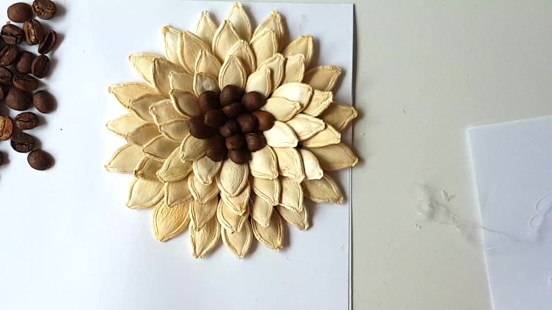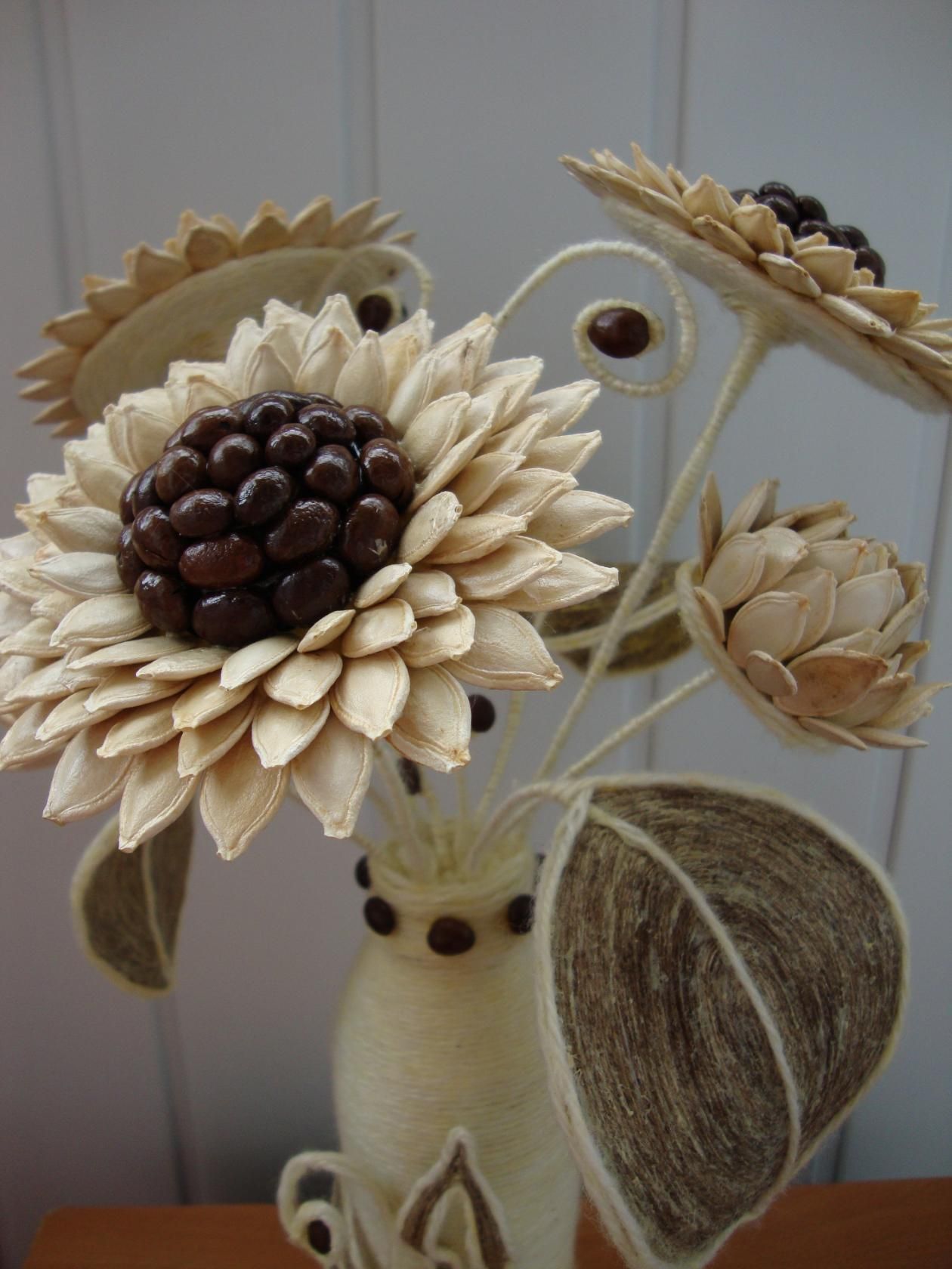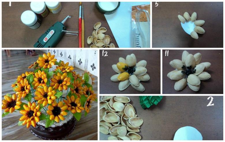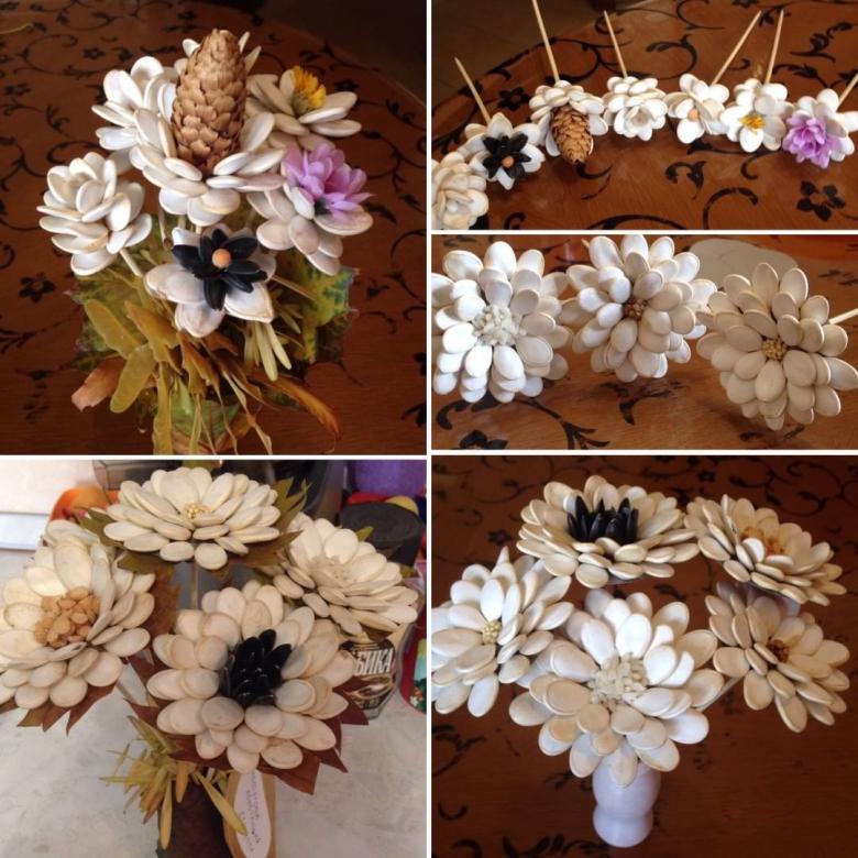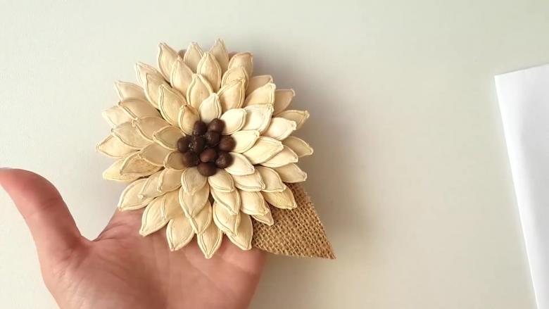 Attachez la fleur à la brindille, en ajoutant des feuilles vertes. Une fois le bouquet assemblé, il est placé dans un vase improvisé fait d'un gobelet en plastique, également recouvert de graines et peint. Les dahlias et les nénuphars expressifs sont merveilleux.
